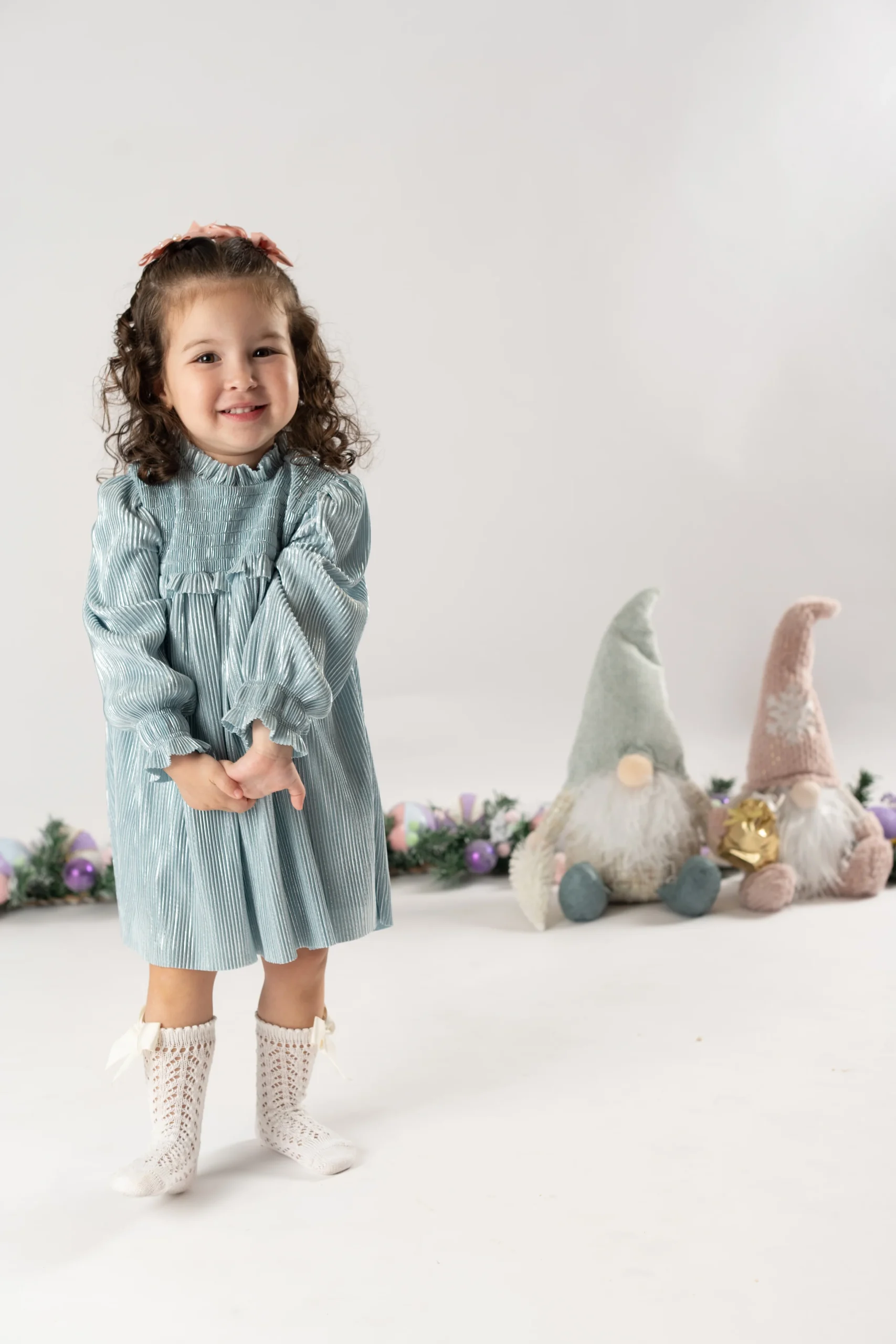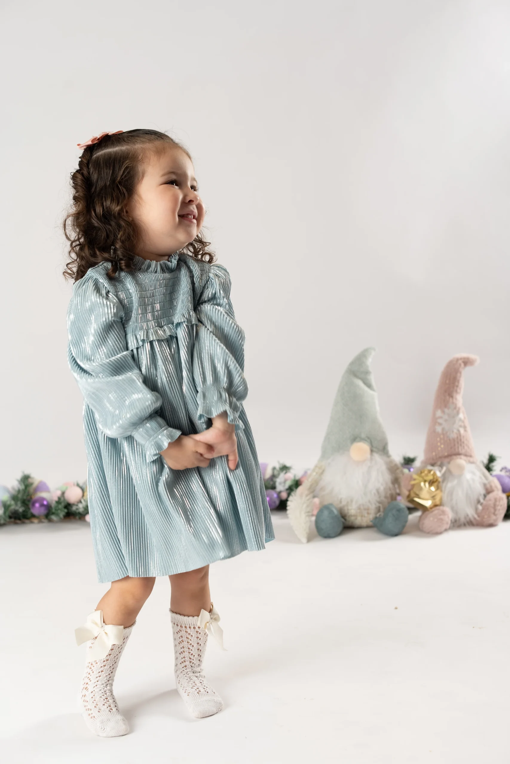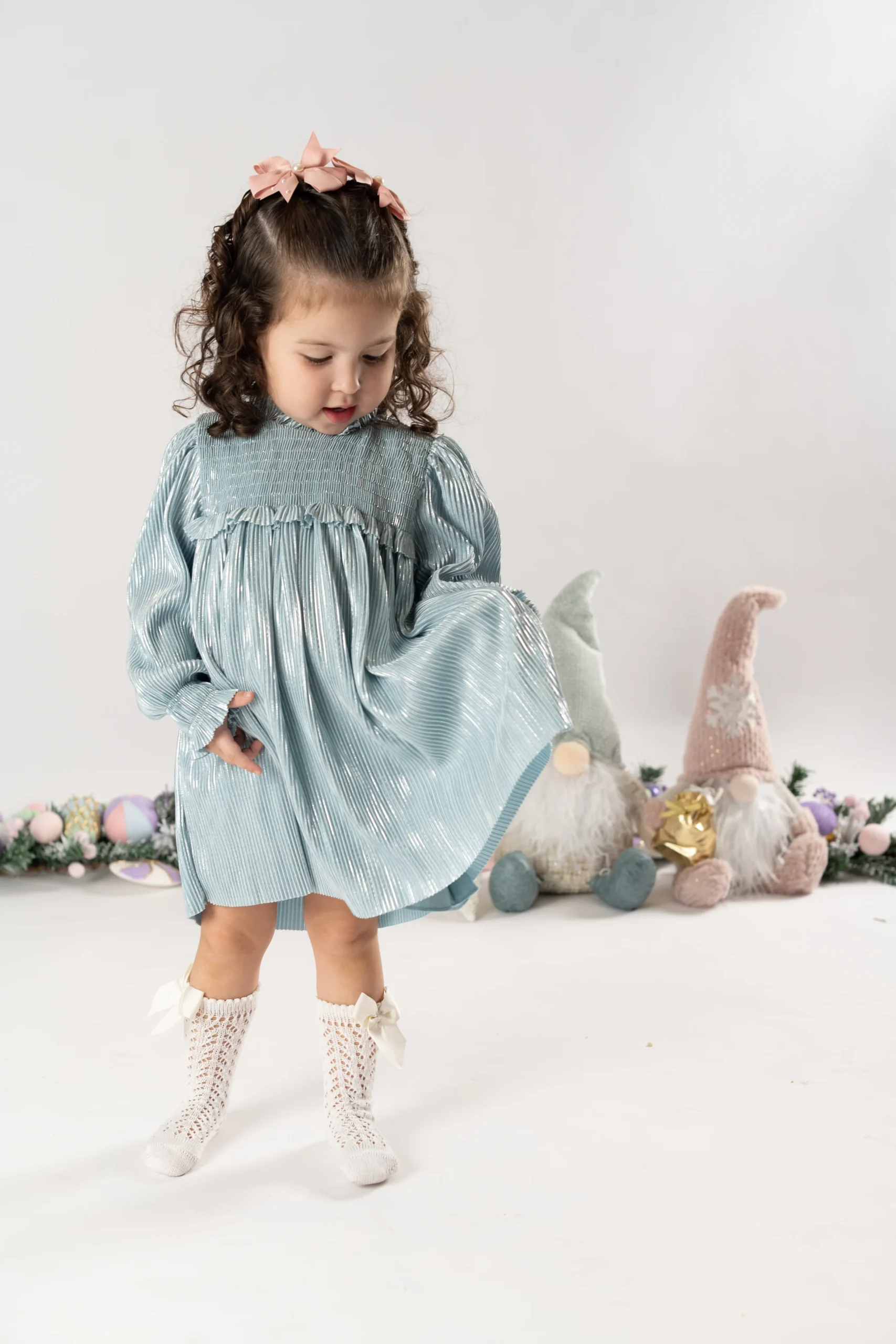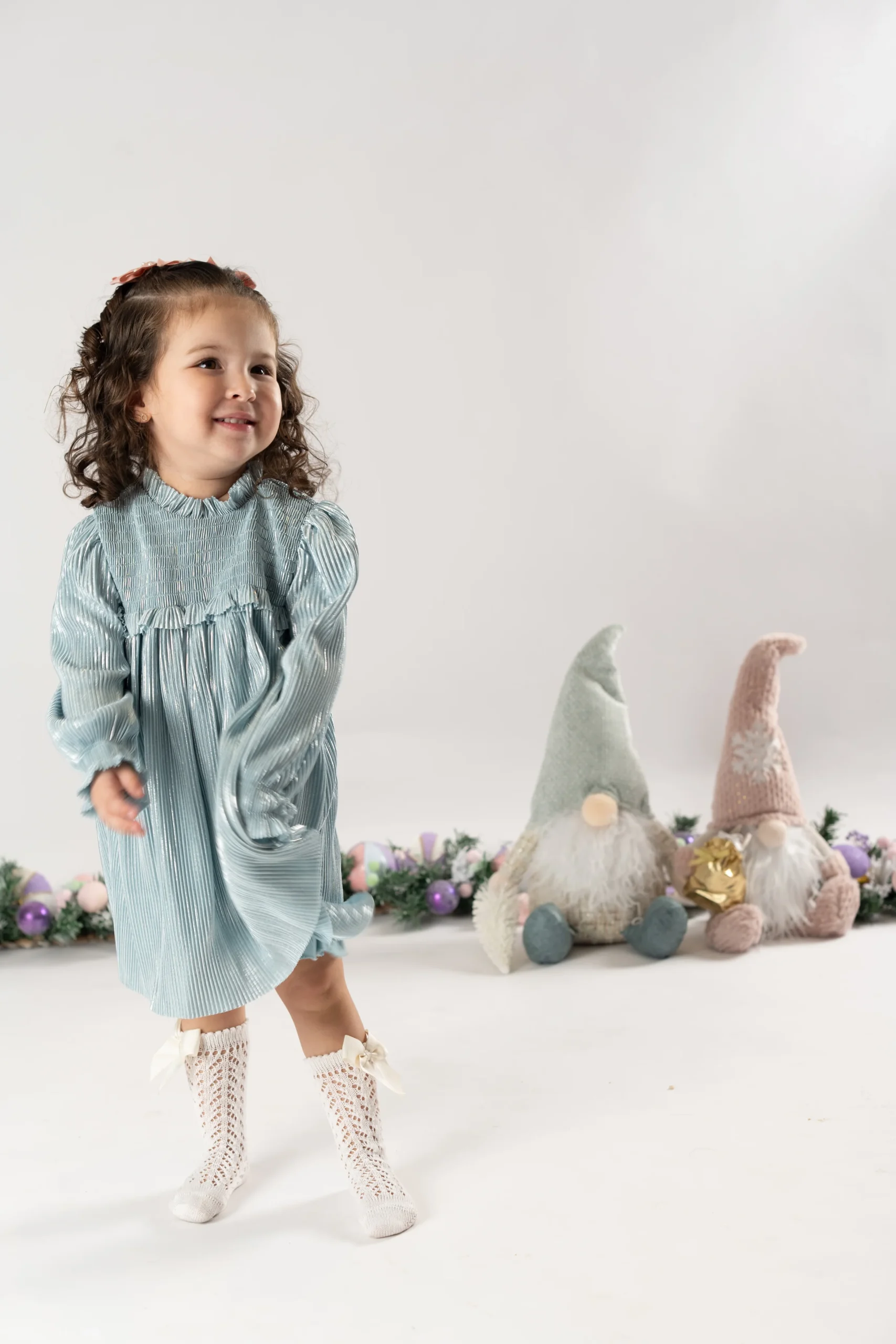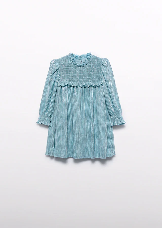 ¡Hermoso vestido plisado con efecto brilloso! Cuello con olan redondo, manga larga con elastico en puños, detalles de nido de abeja en el pecho, rizo y volantes, tela plisada con efecto brilloso, cierre de botones por atras.