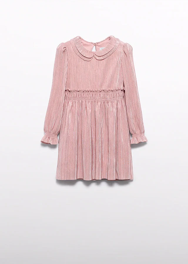 ¡Hermoso vestido plisado con efecto brilloso! Cuello camisero redondo, manga larga con elastico en puños, detalles de elastico en cadera para acentuar la silueta de las niñas, tela plisada con efecto brilloso, cierre de unico boton por atras.