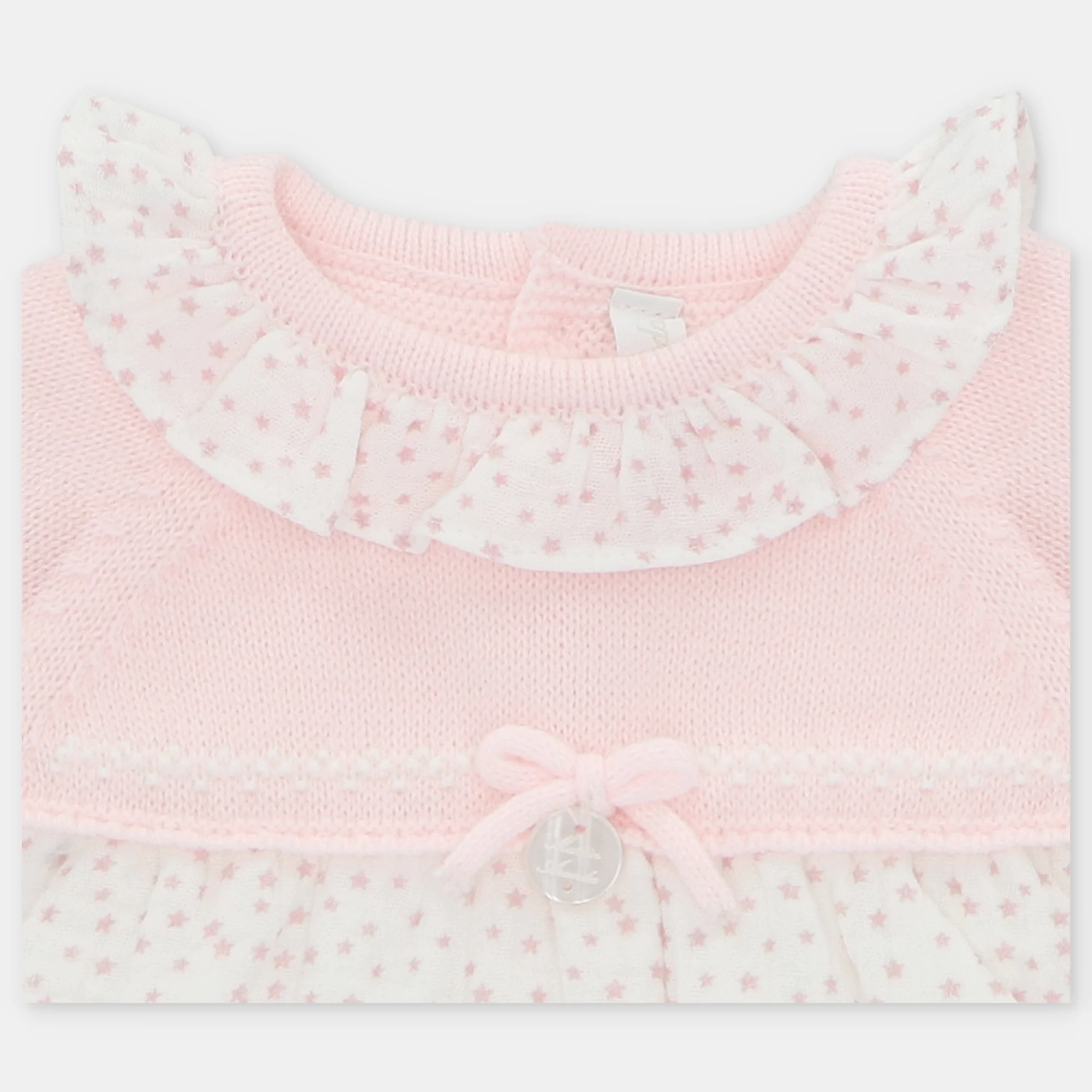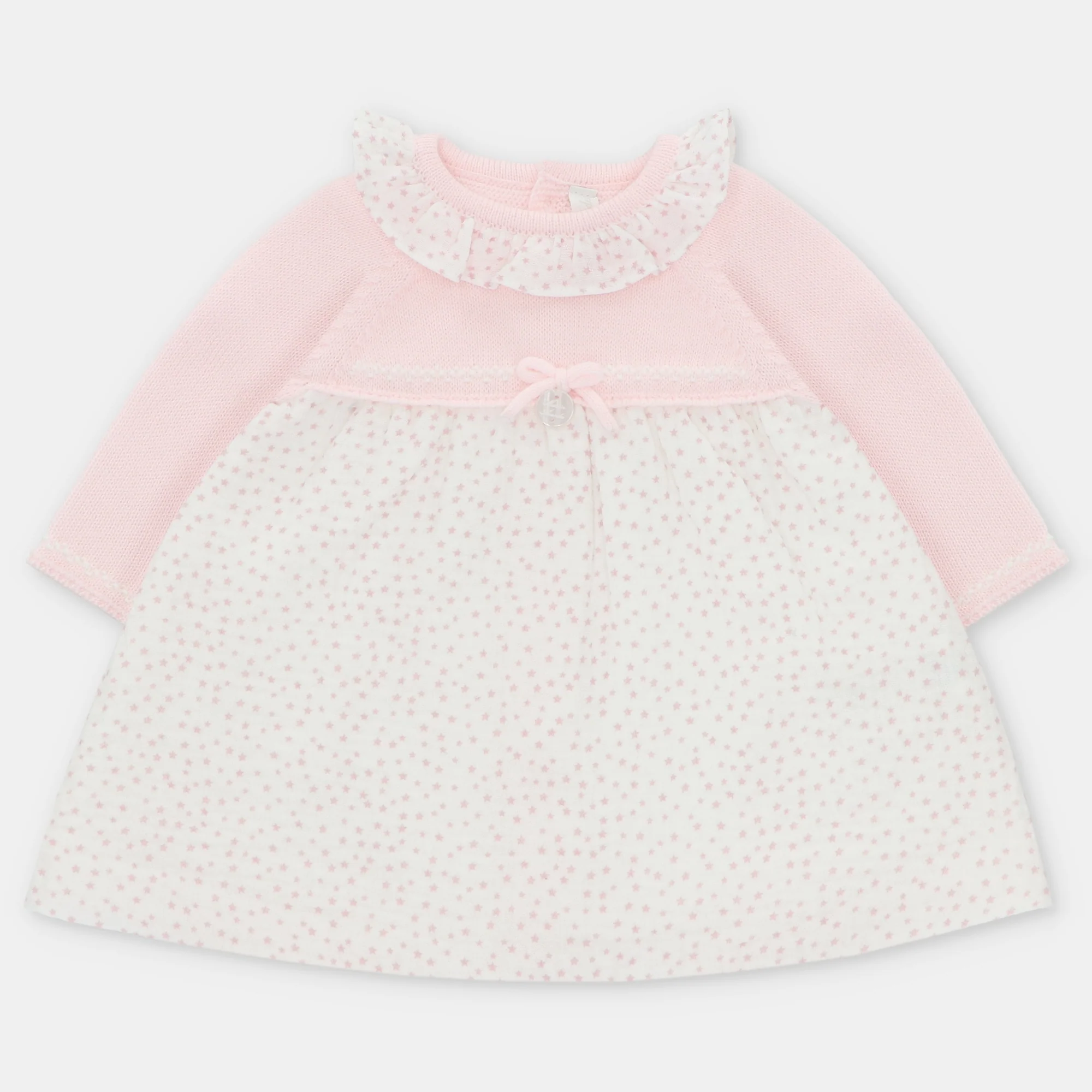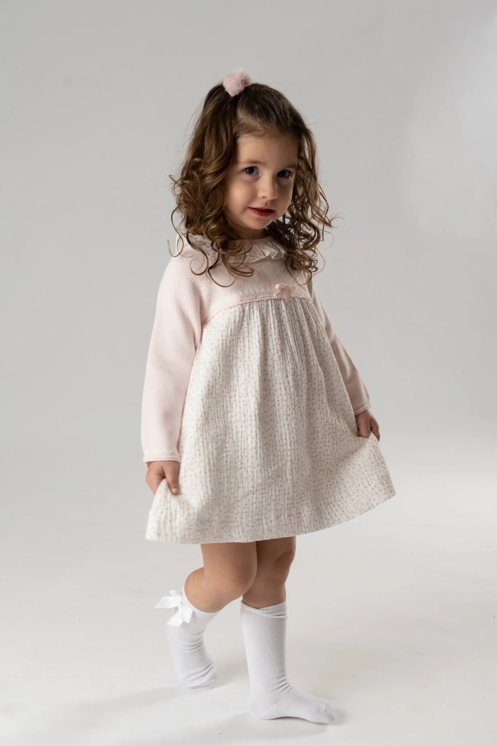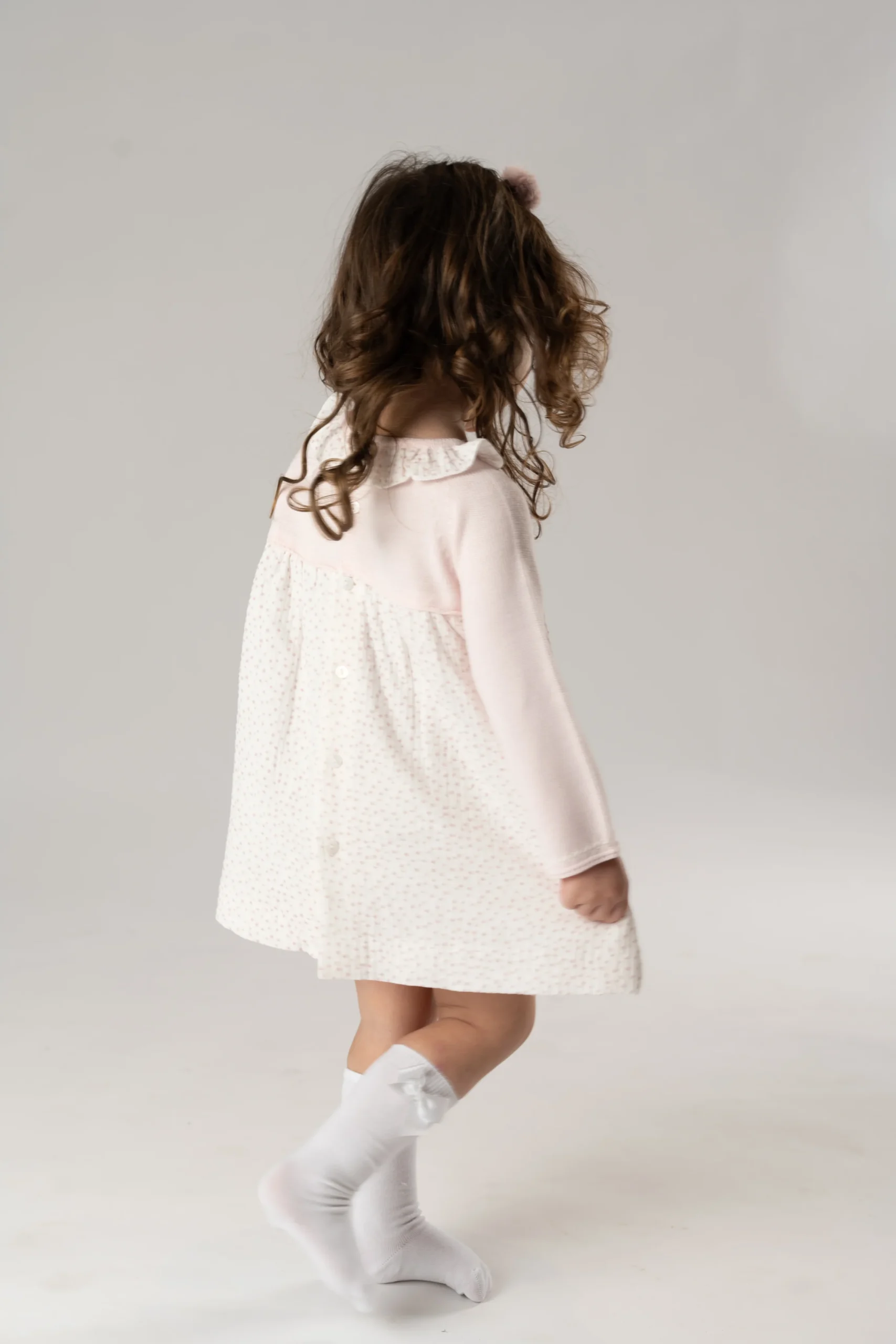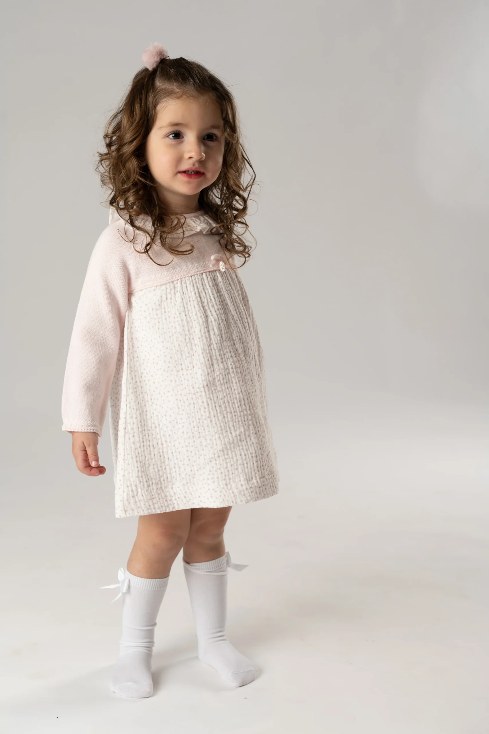 ¡Hermoso vestido combinado de tejido y tela con estampado! ¡Un vestido basico para el guardarropa de las niñas, ya que es una prenda muy versatil pensada para cualquier ocasion! Parte de arriba tipo tejida de punto con relieve, cuello redondo con olan, manga larga, corte en la cadera con lazo, tela con plumety. Cierre de botones por la parte de atras para facilitar su puesta.