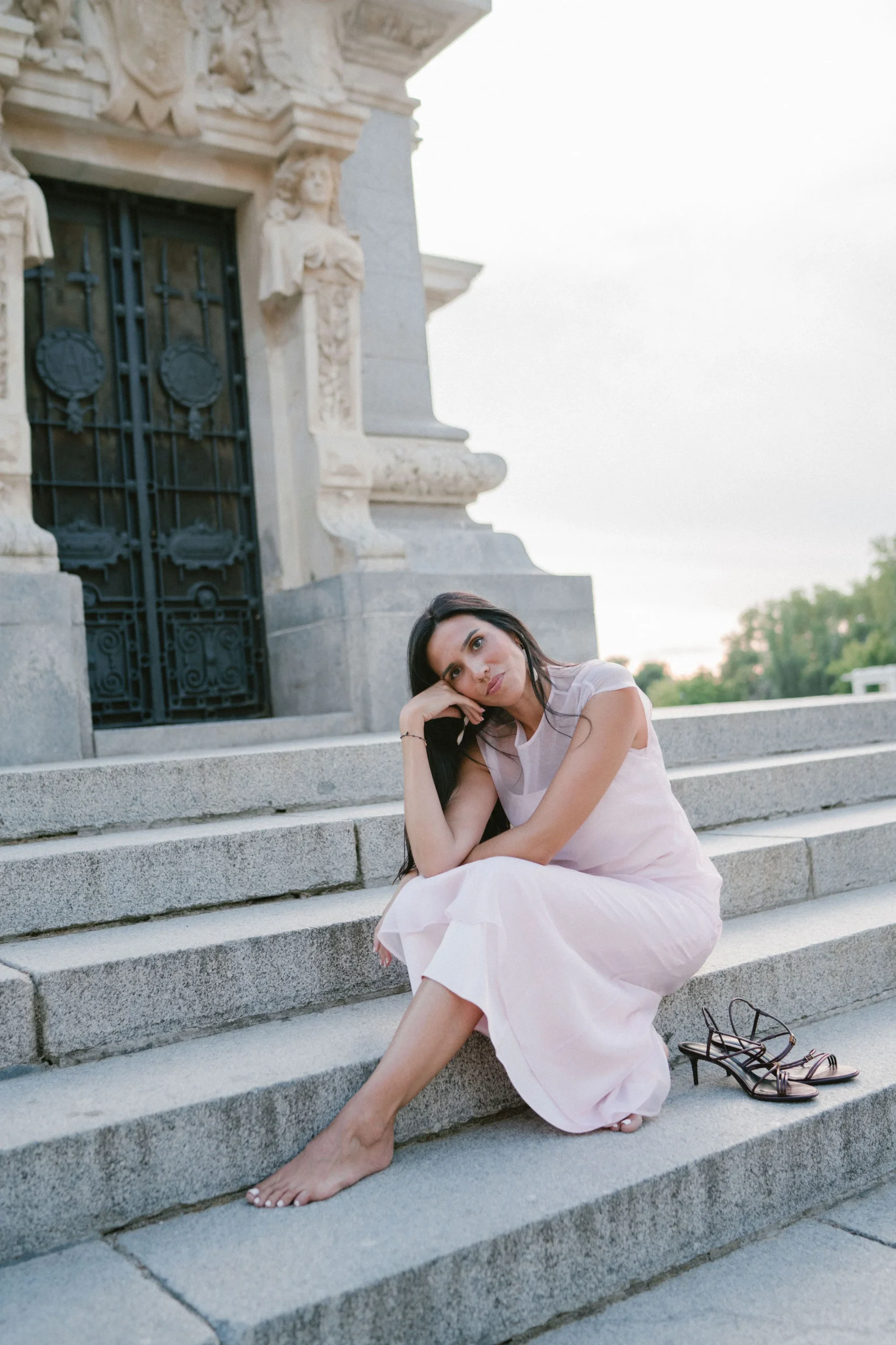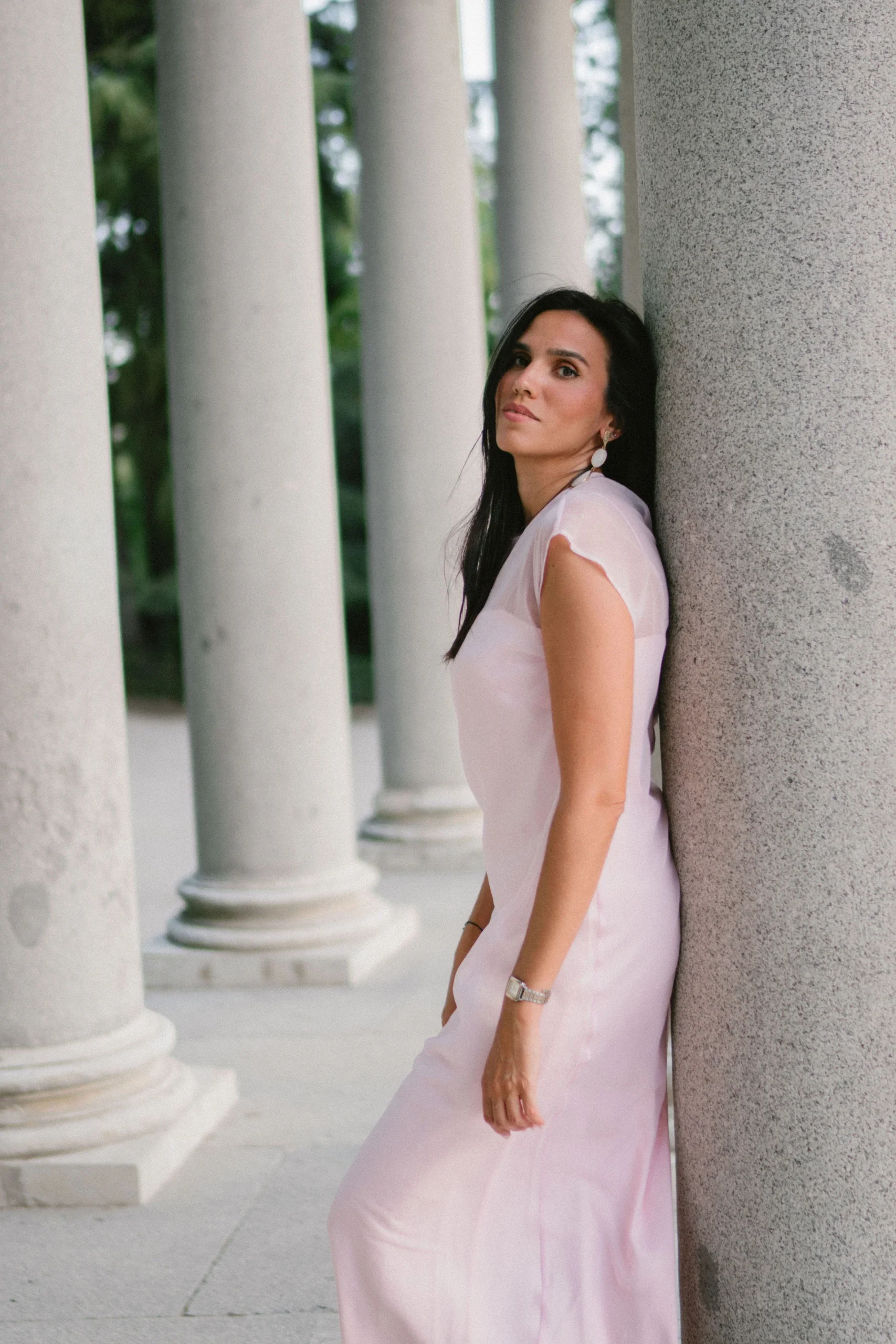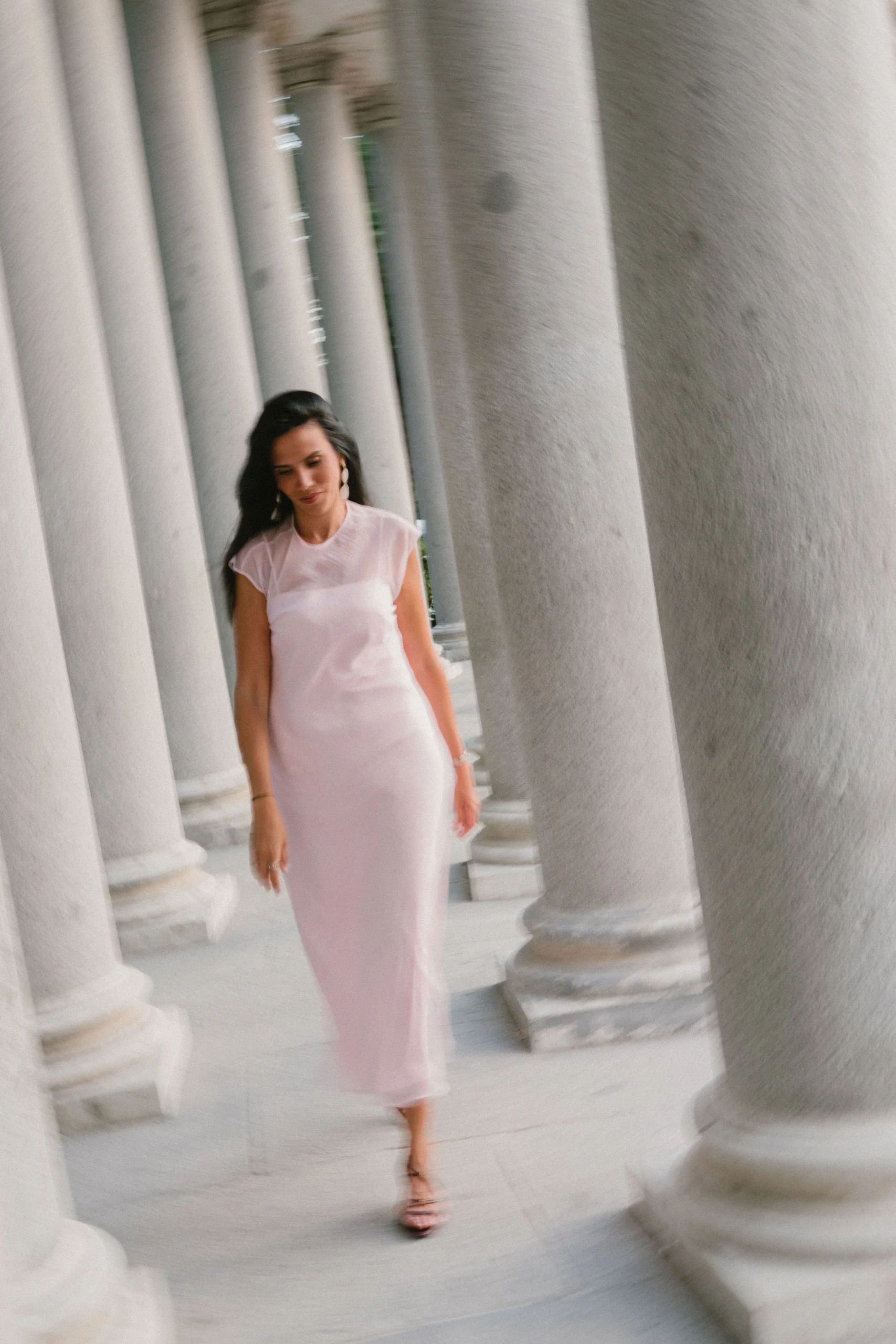 Un conjunto que se transforma contigo. Vestido lencero satinado de tirantes, suave al tacto y con caída fluida, cubierto por un delicado vestido de organza en tono rosa maquillaje. La organza, de largo sutilmente mayor, crea un juego de texturas y volúmenes, y se cierra en la espalda con un botón forrado.