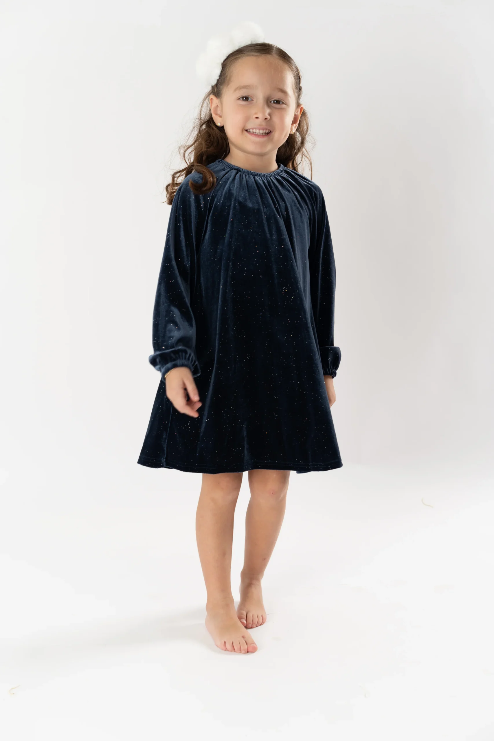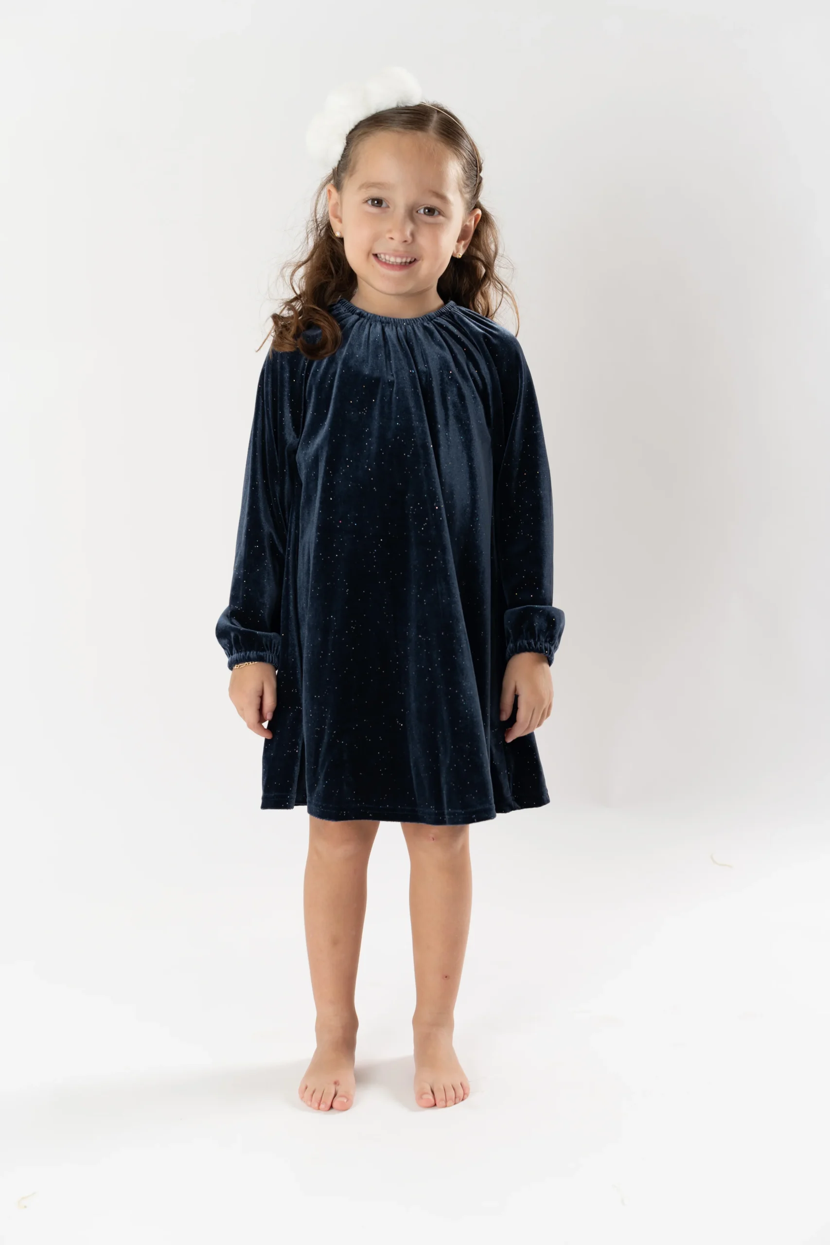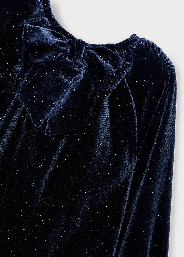 ¡Divino confección en tejido de terciopelo elegante y clásico! Vestido cuello redondo con elástico, manga larga con puños elásticos y cierre con un único botón con detalle de lazo.