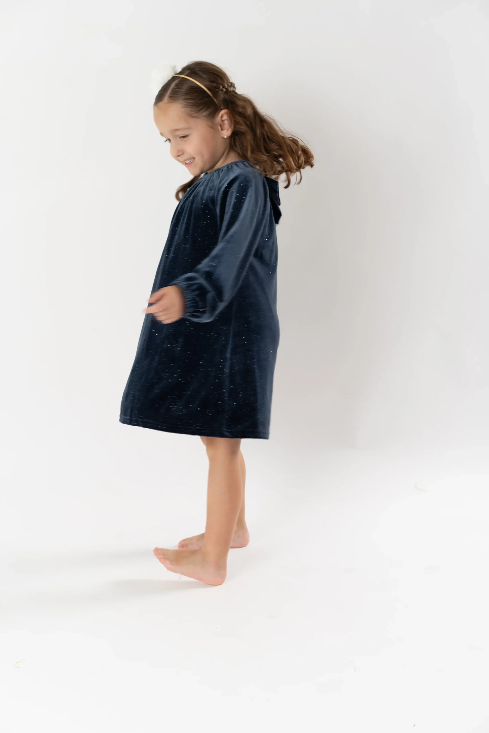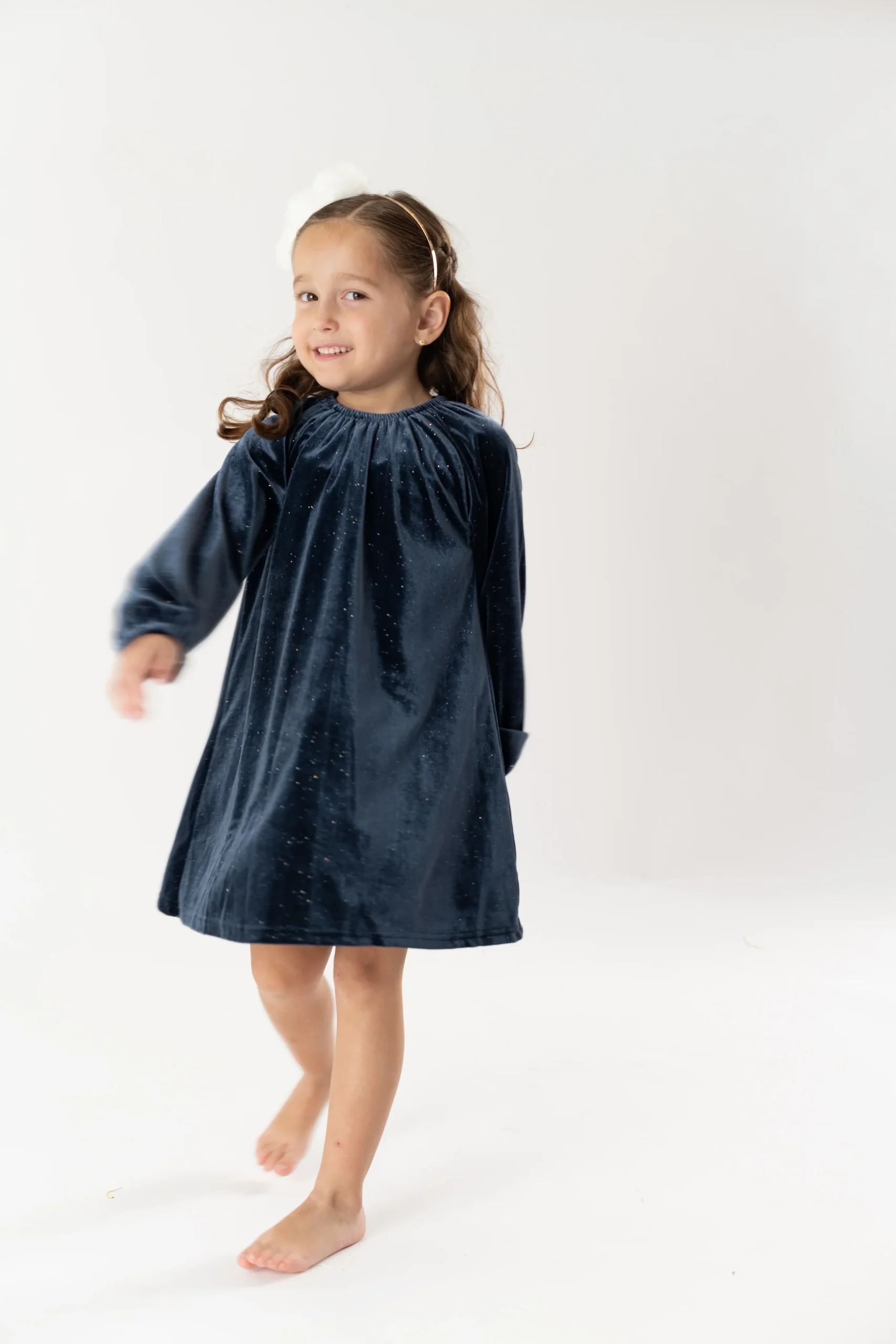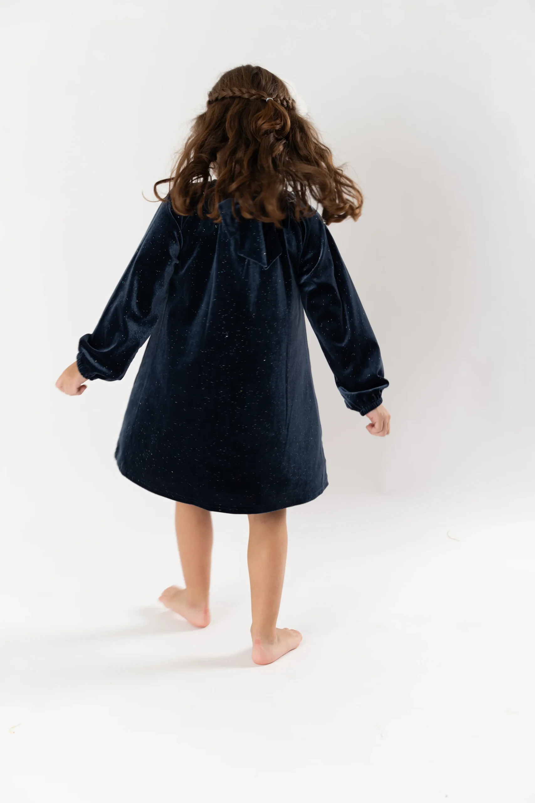 ¡Divino confección en tejido de terciopelo elegante y clásico! Vestido cuello redondo con elástico, manga larga con puños elásticos y cierre con un único botón con detalle de lazo.