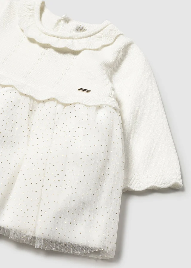 ¡Encantador vestido combinada de tejido con tela para conseguir un diseño único y especial! Parte de arriba tejida, cuello redondo con olan, manga larga, corte en la cintura, falda en tela de tul brillante, cierre con botones en la espalda para facilitar la puesta de la prenda.