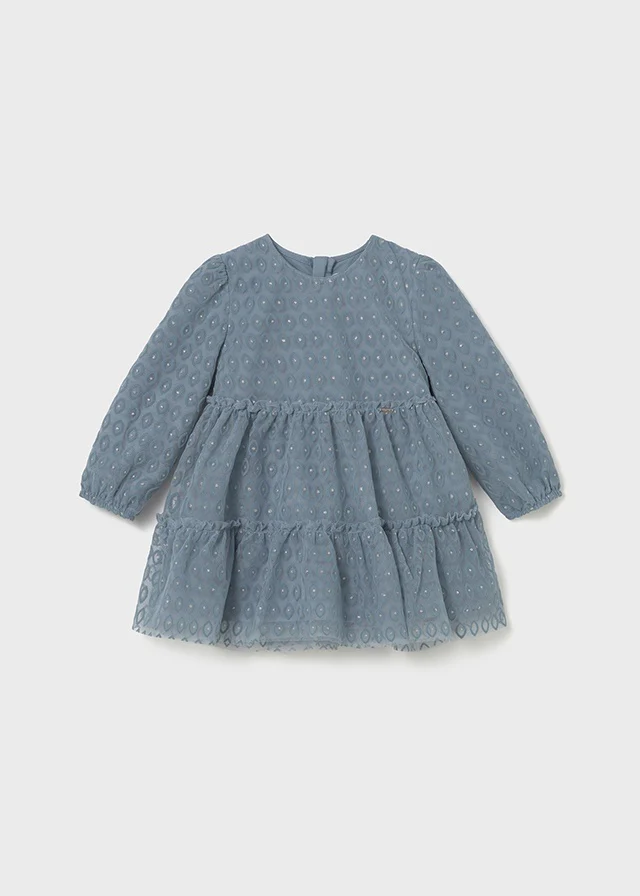 ¡Divino vestido confeccionado en tejido de tul ligero y vaporoso! Vestido de manga larga, cuello redondo, detalle de rizo y volantes, cierre de ziper por la parte de atras para una puesta ágil y rápida. Modelo con forro interior.