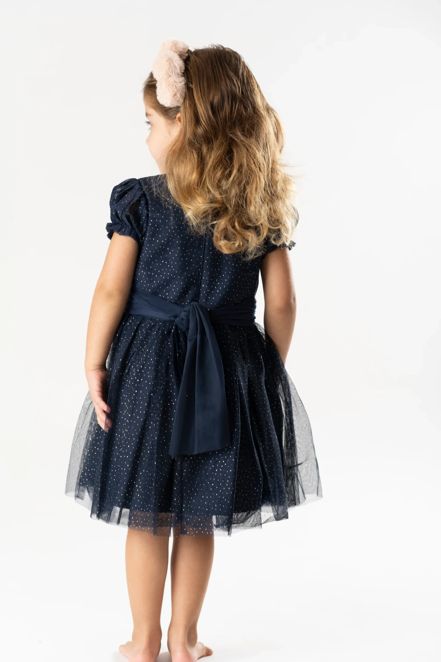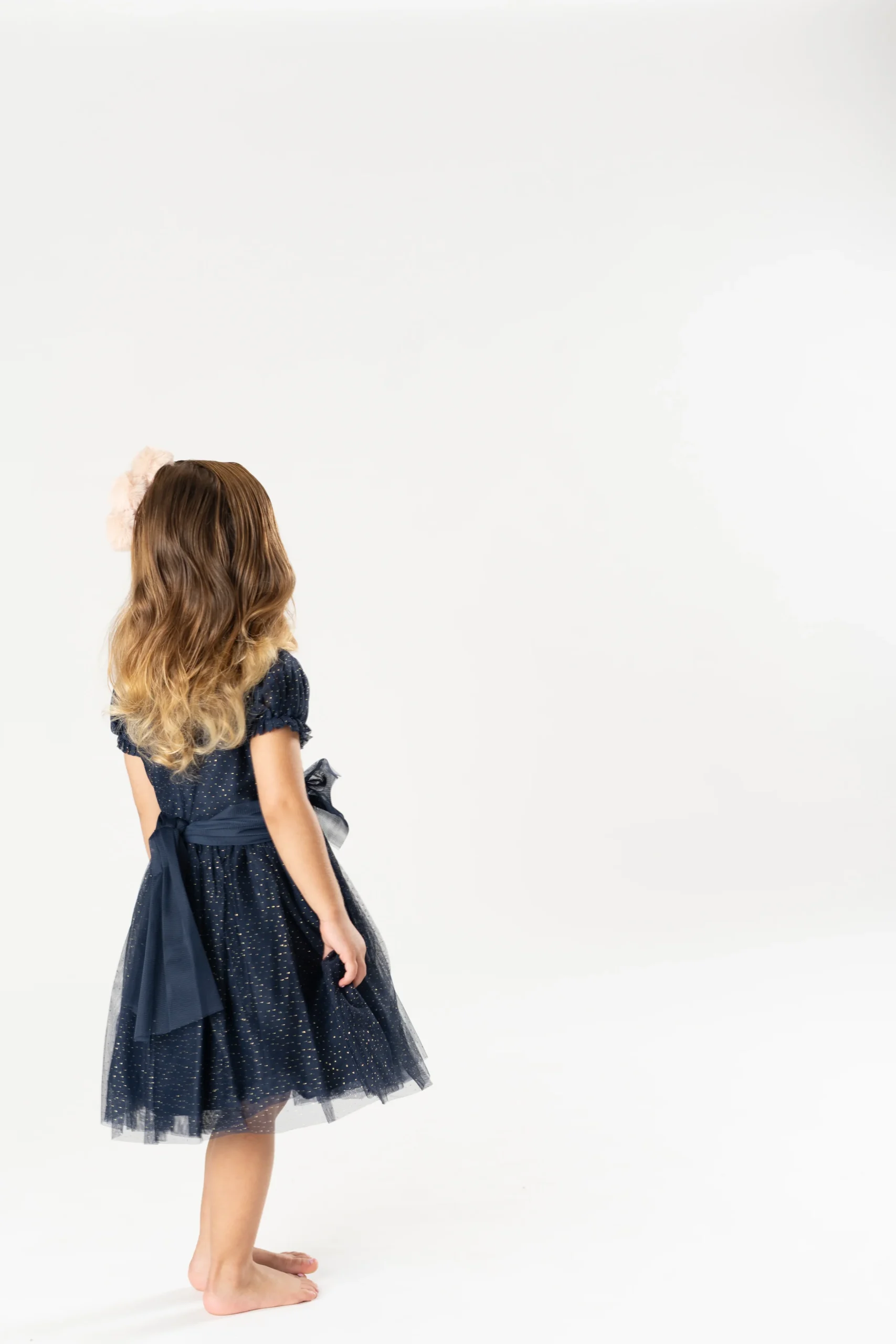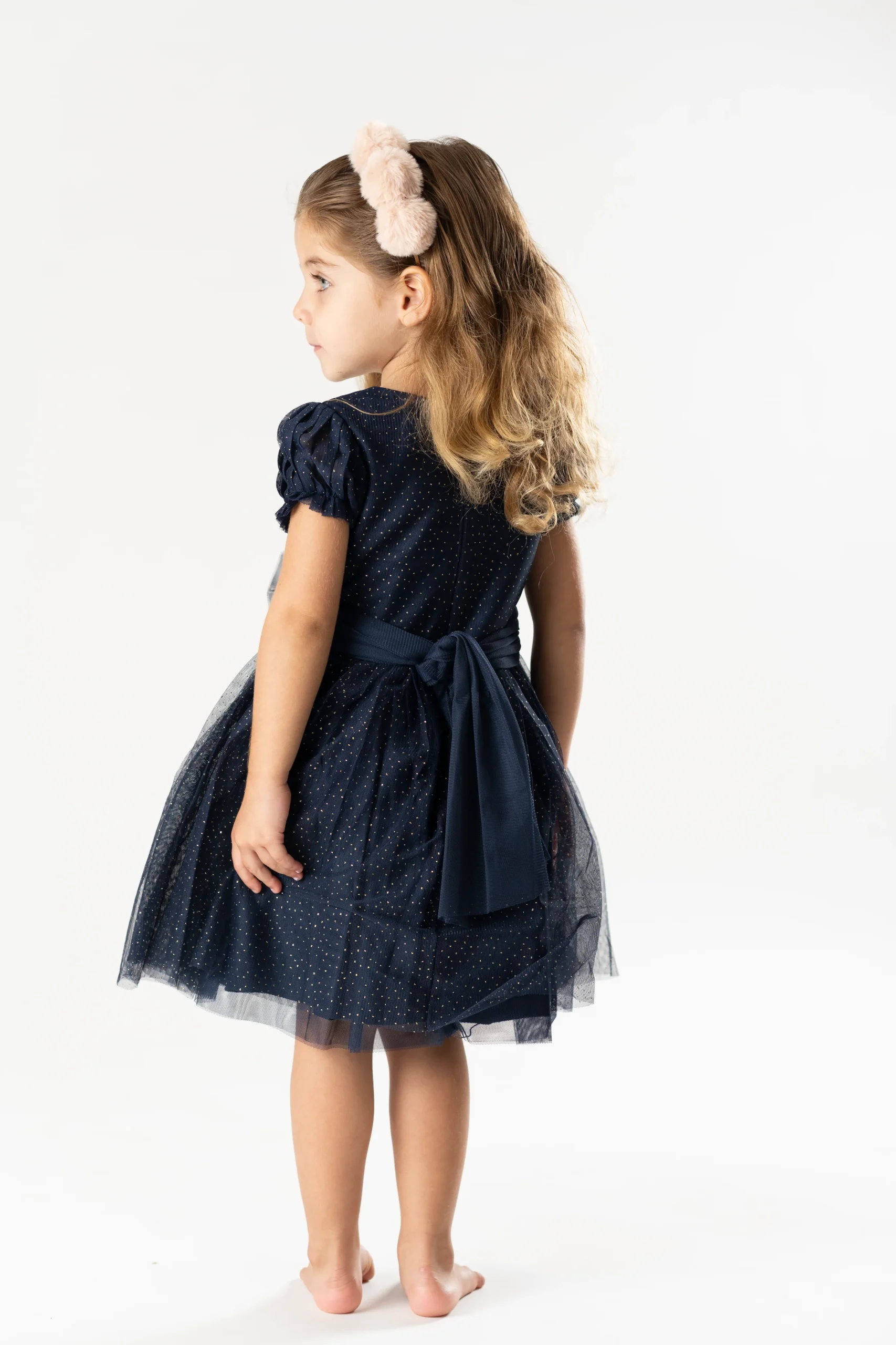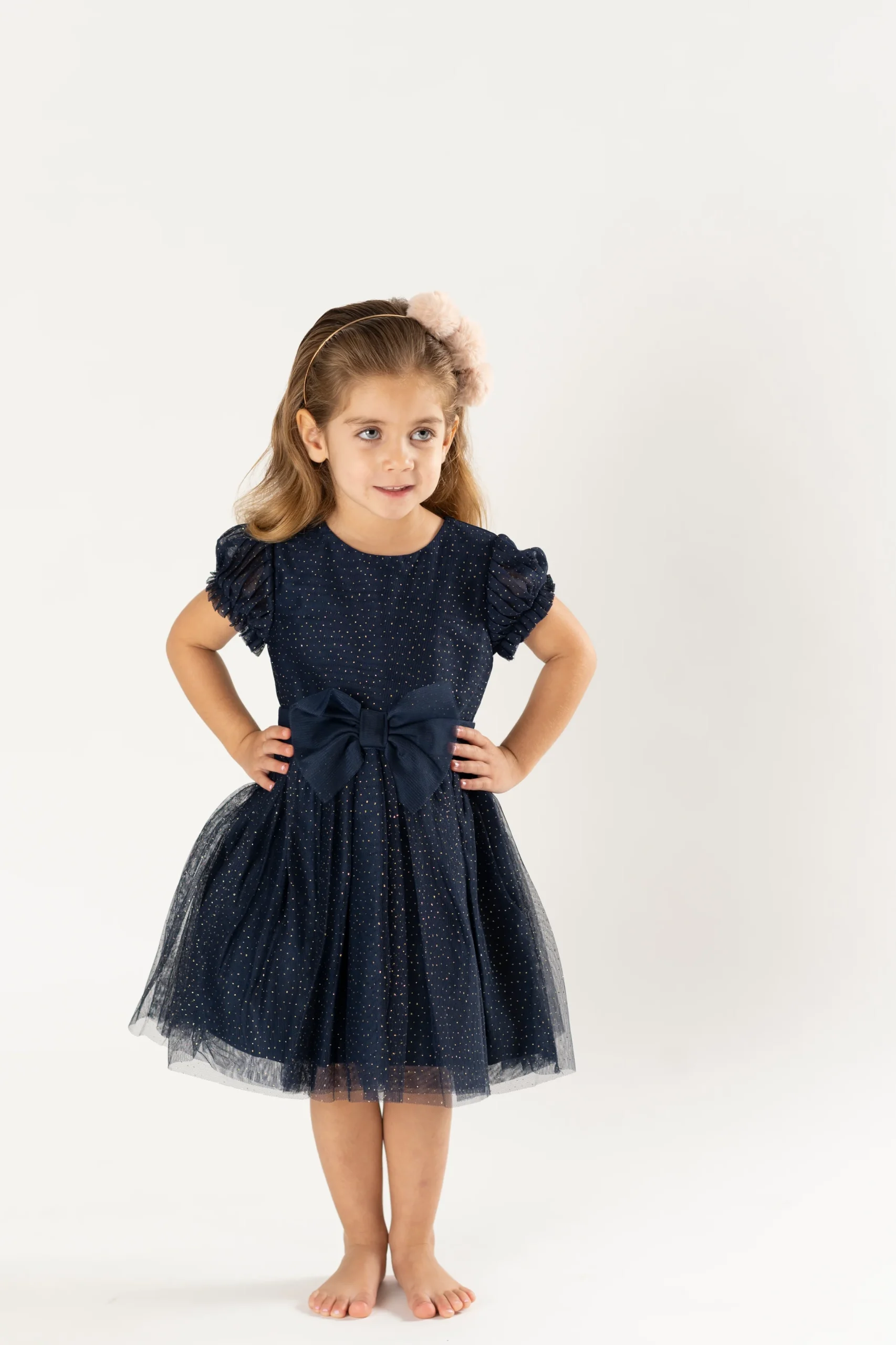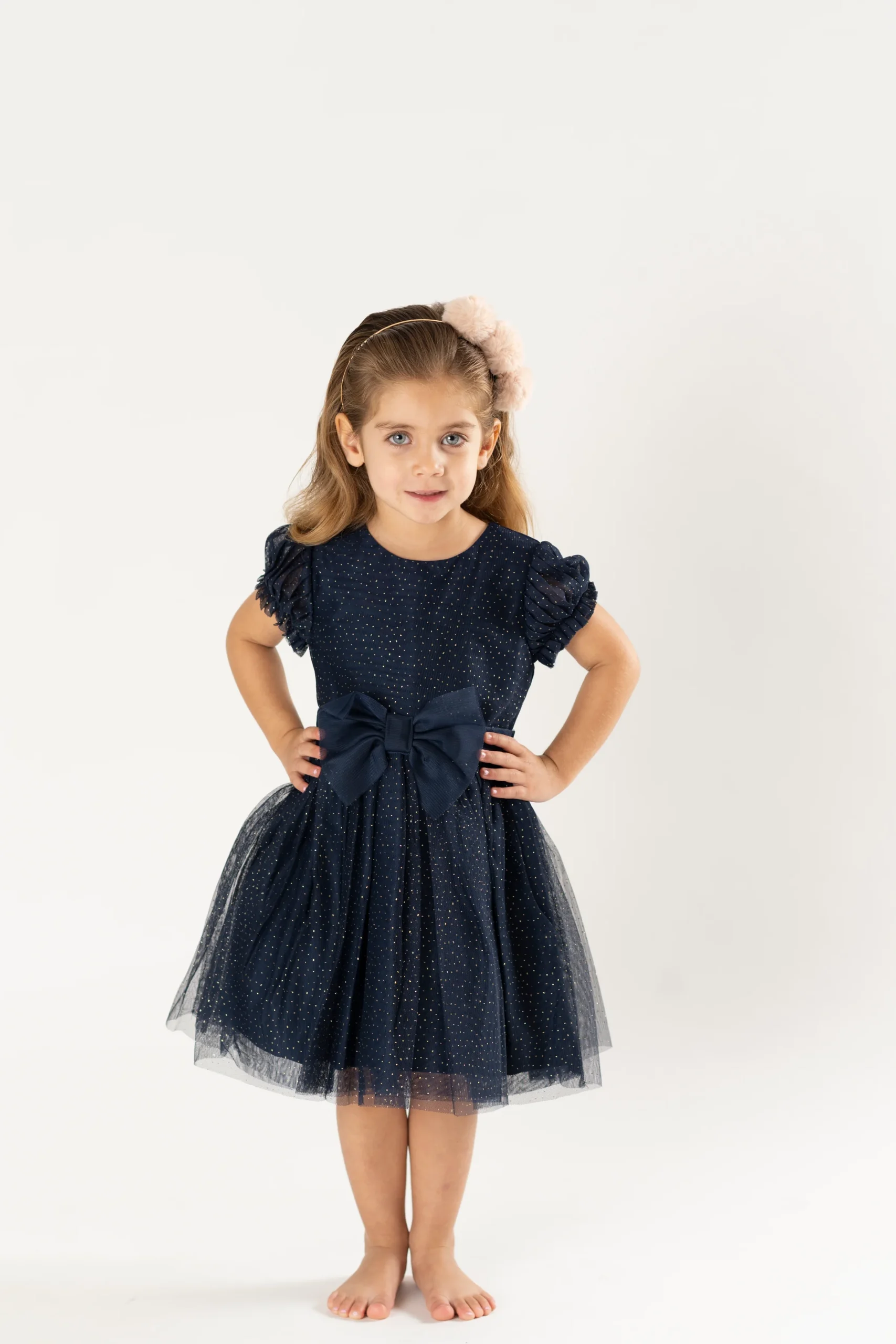 ¡Divino vestido con detalles unicos que lo hacen lucir elegante! Vestido de cuello redondo, manga corta, tela de tul con glitter, cierre de ziper y lazo por detras. Pensado para las ocasiones mas especiales Combinalo con su vestido a juego para hermanitas «Vestido tul glitter marino»