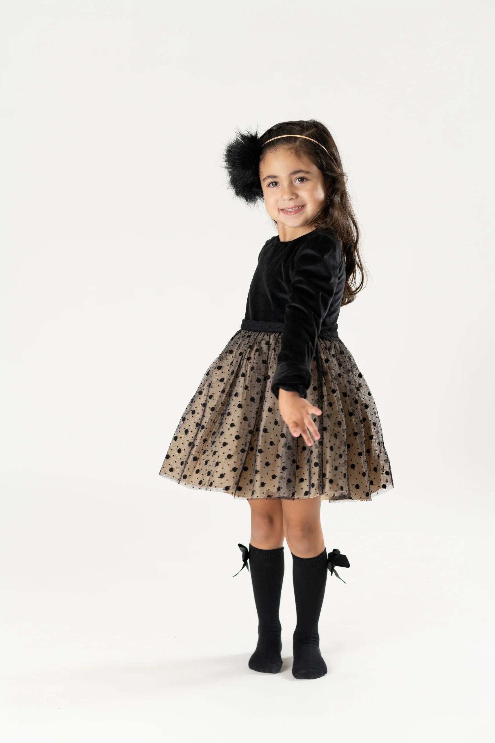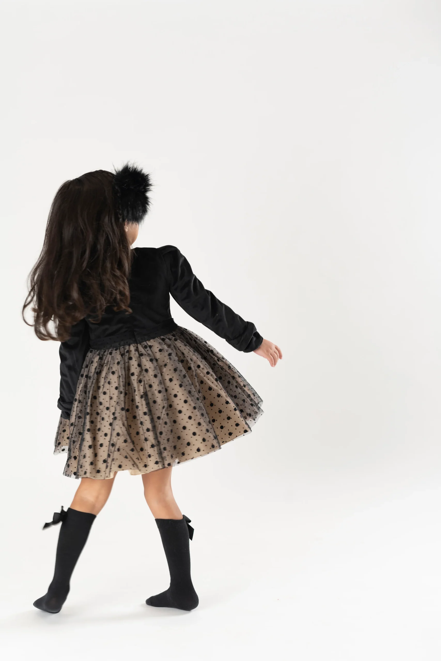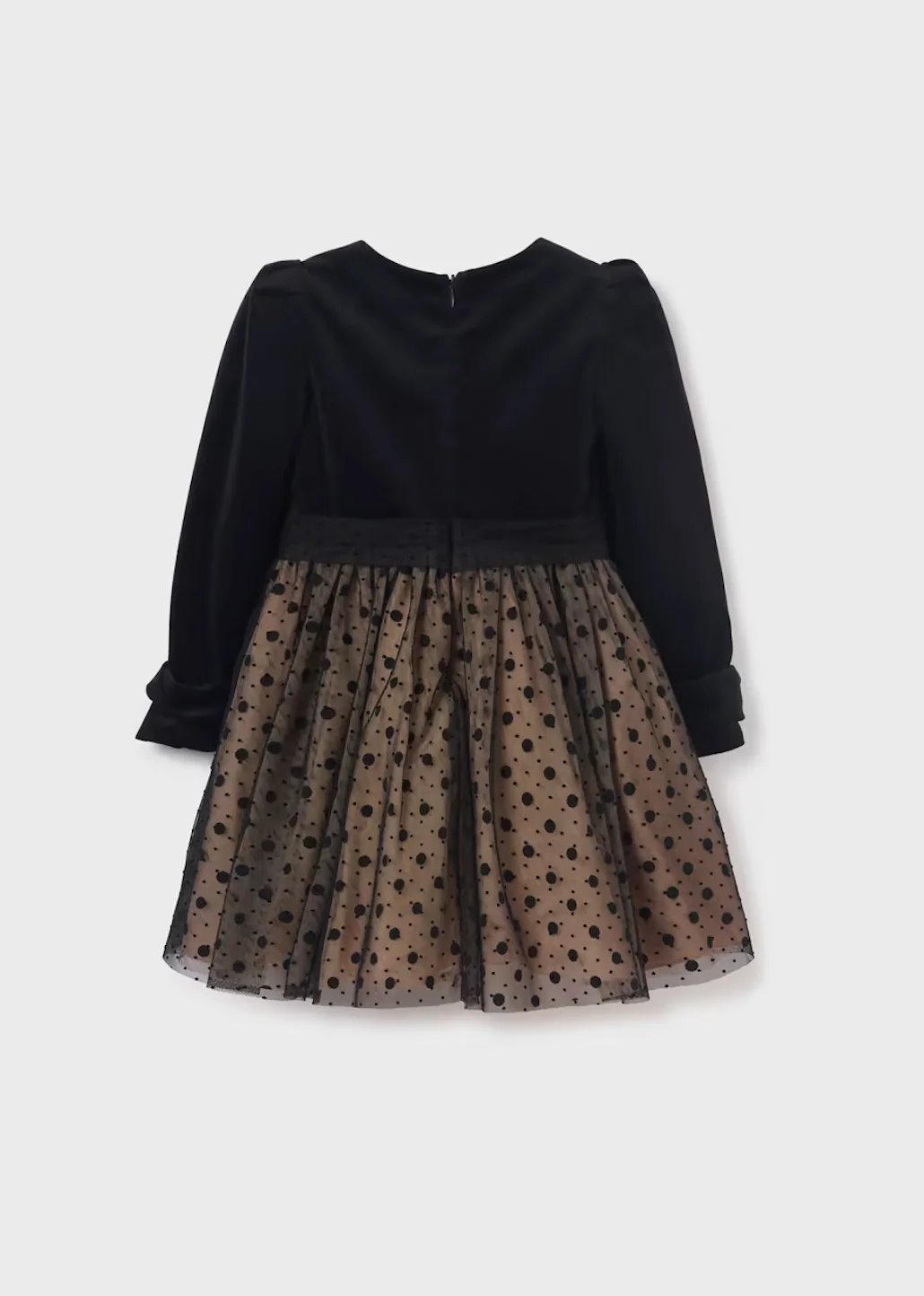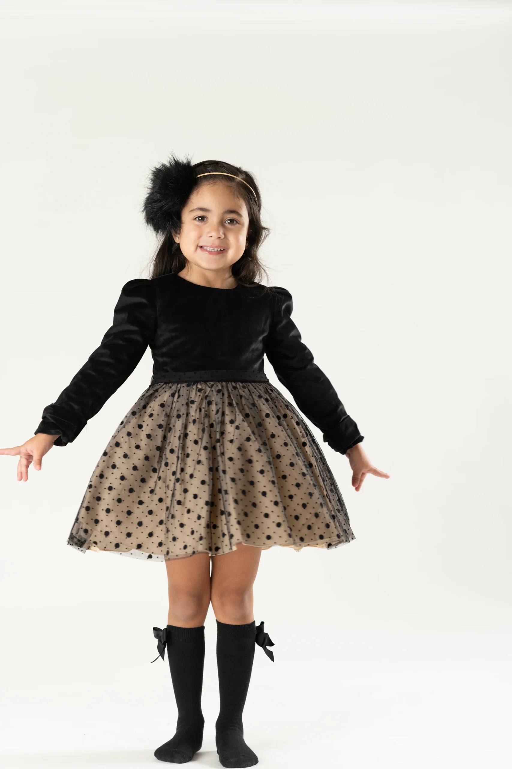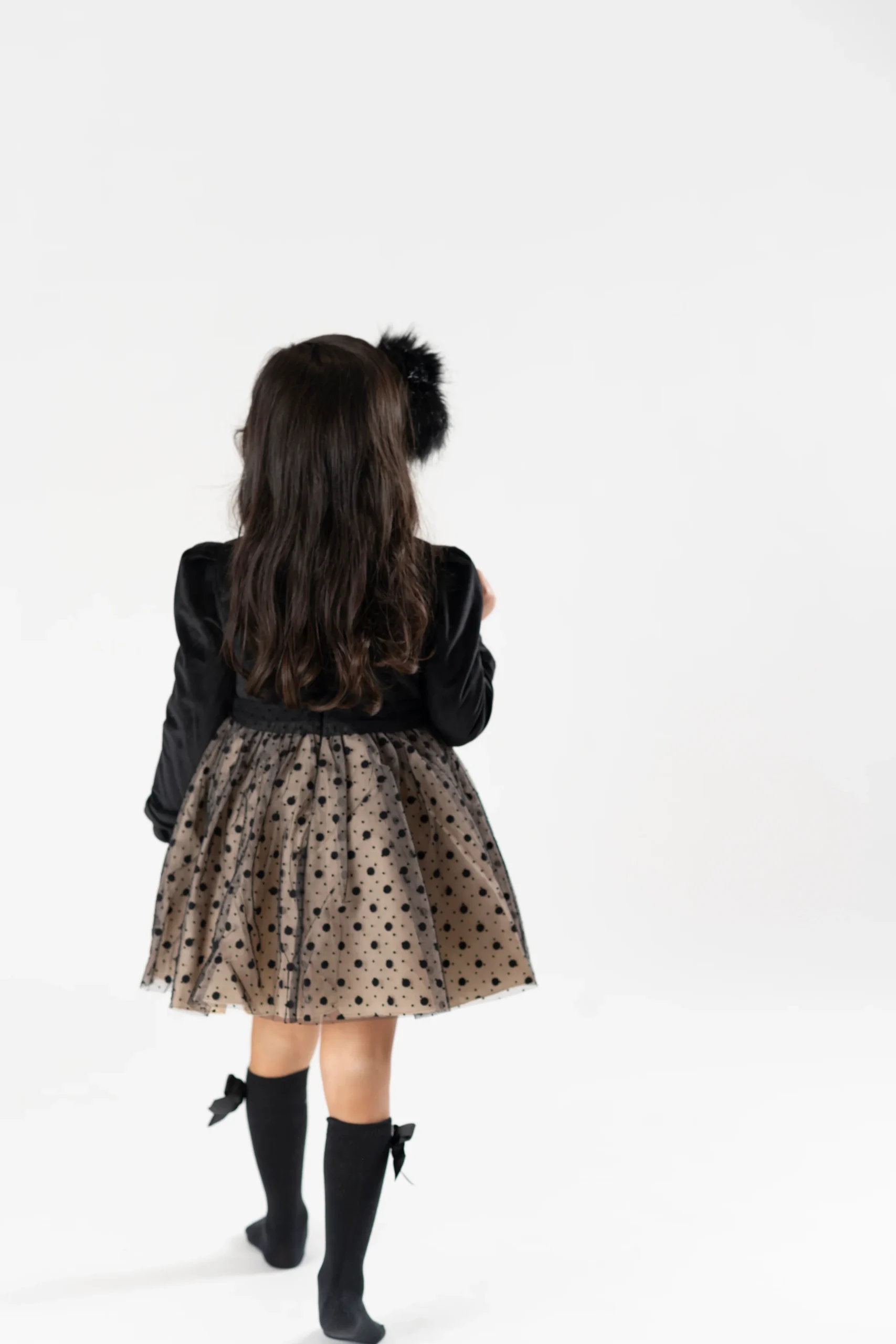 ¡Divino vestido negro con topos flocados lleno de detalles que lo hacen lucir elegante! Detalle de terciopelo en parte superior y cinto en la cintura. Cierre de zipper por atrás para una puesta fácil y rápida.