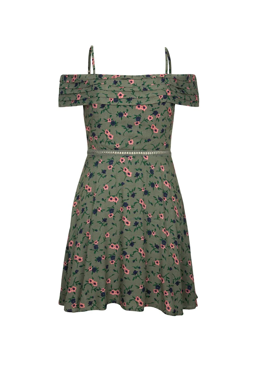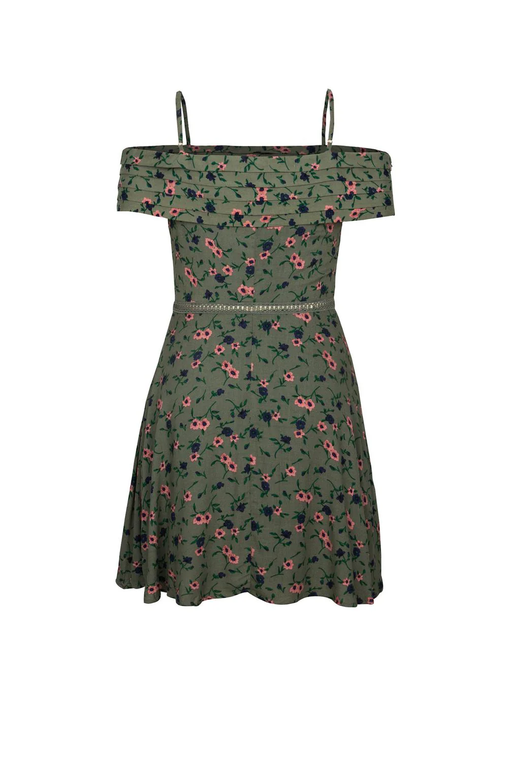 Vestido estampado con tirantes ajustables, pieza con alforzas decorativas, aplicación en cintura y cierre invisible en costado. 20-1447