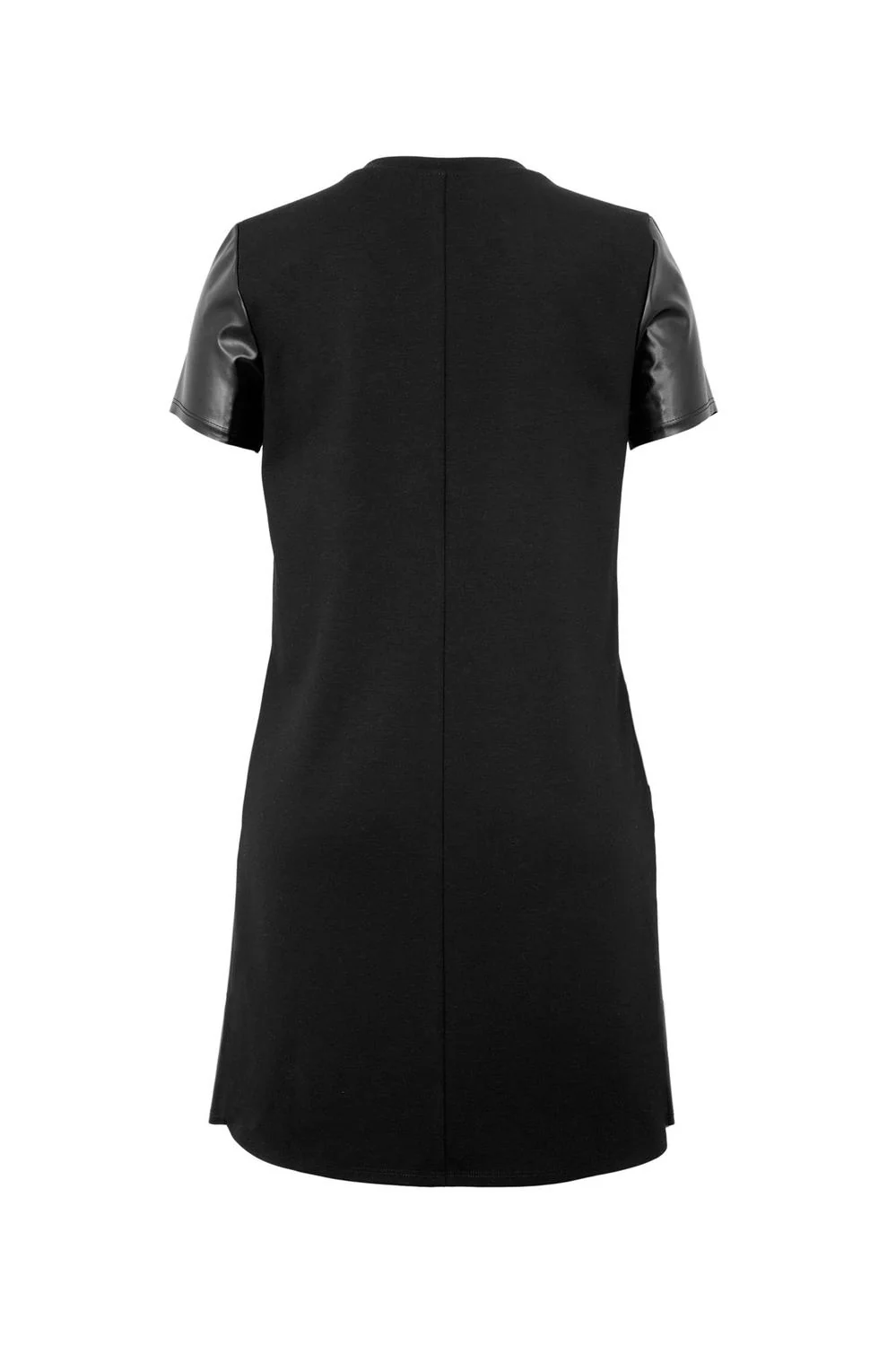 - Vestido corto en combinación de texturas con cortes decorativos, bolsillos laterales y mangas cortas.