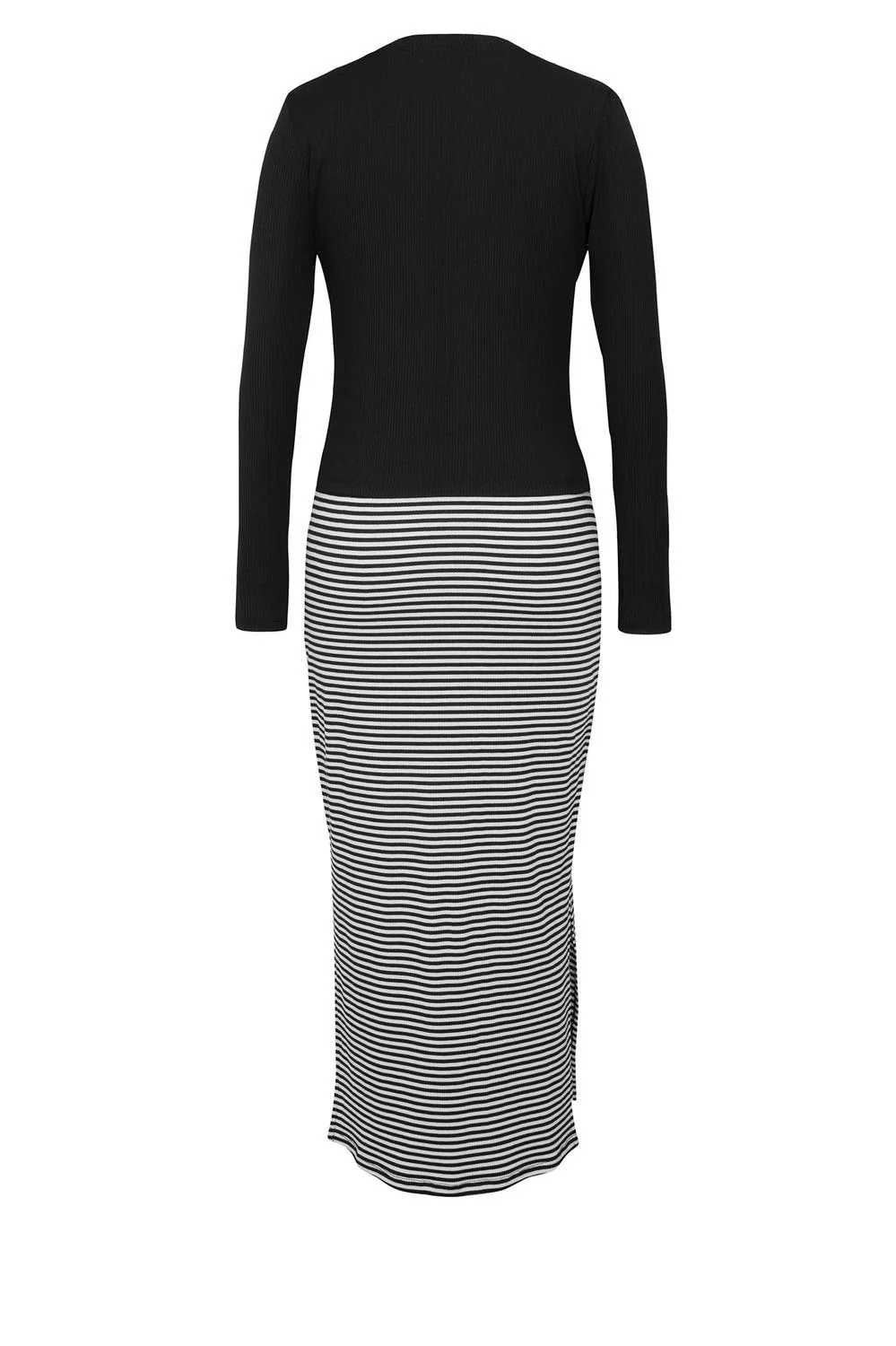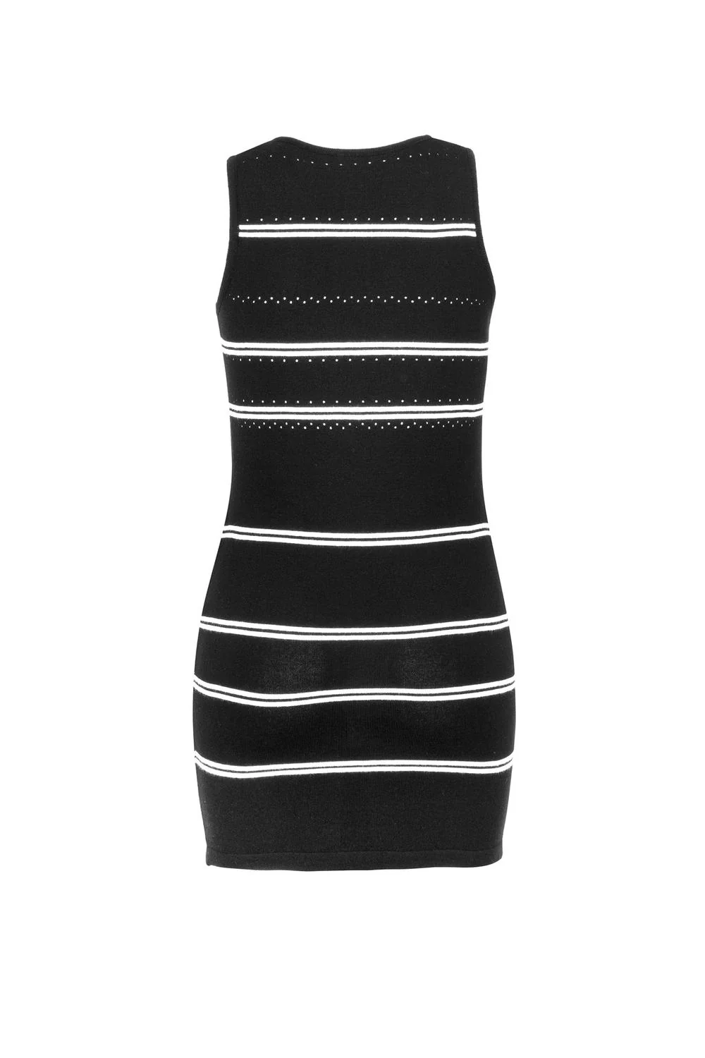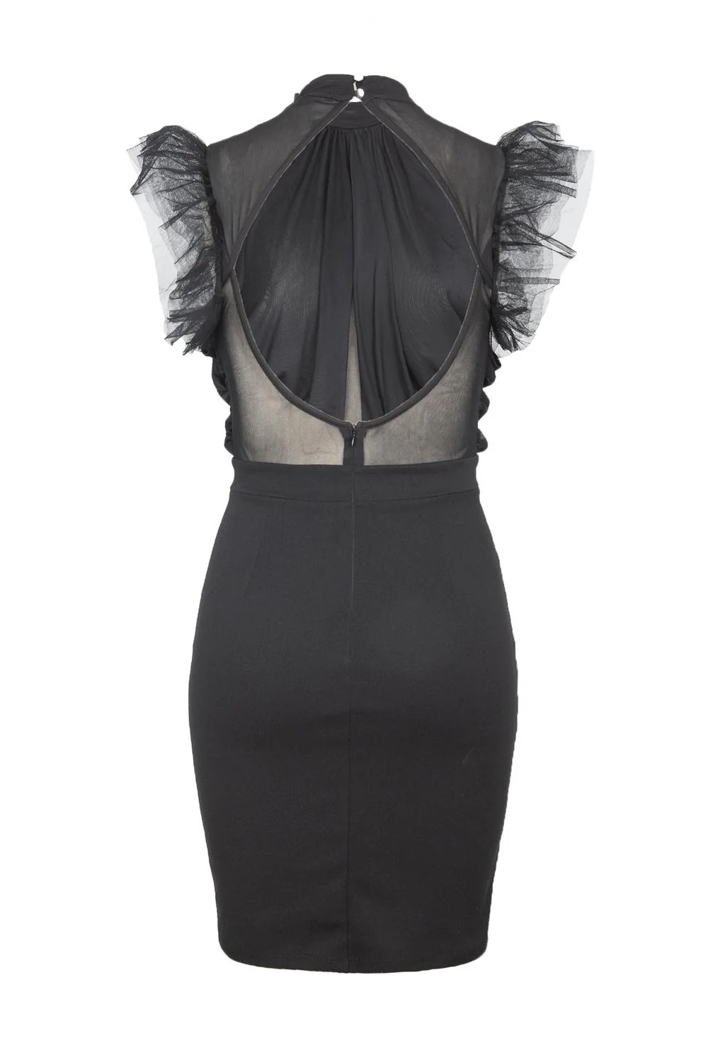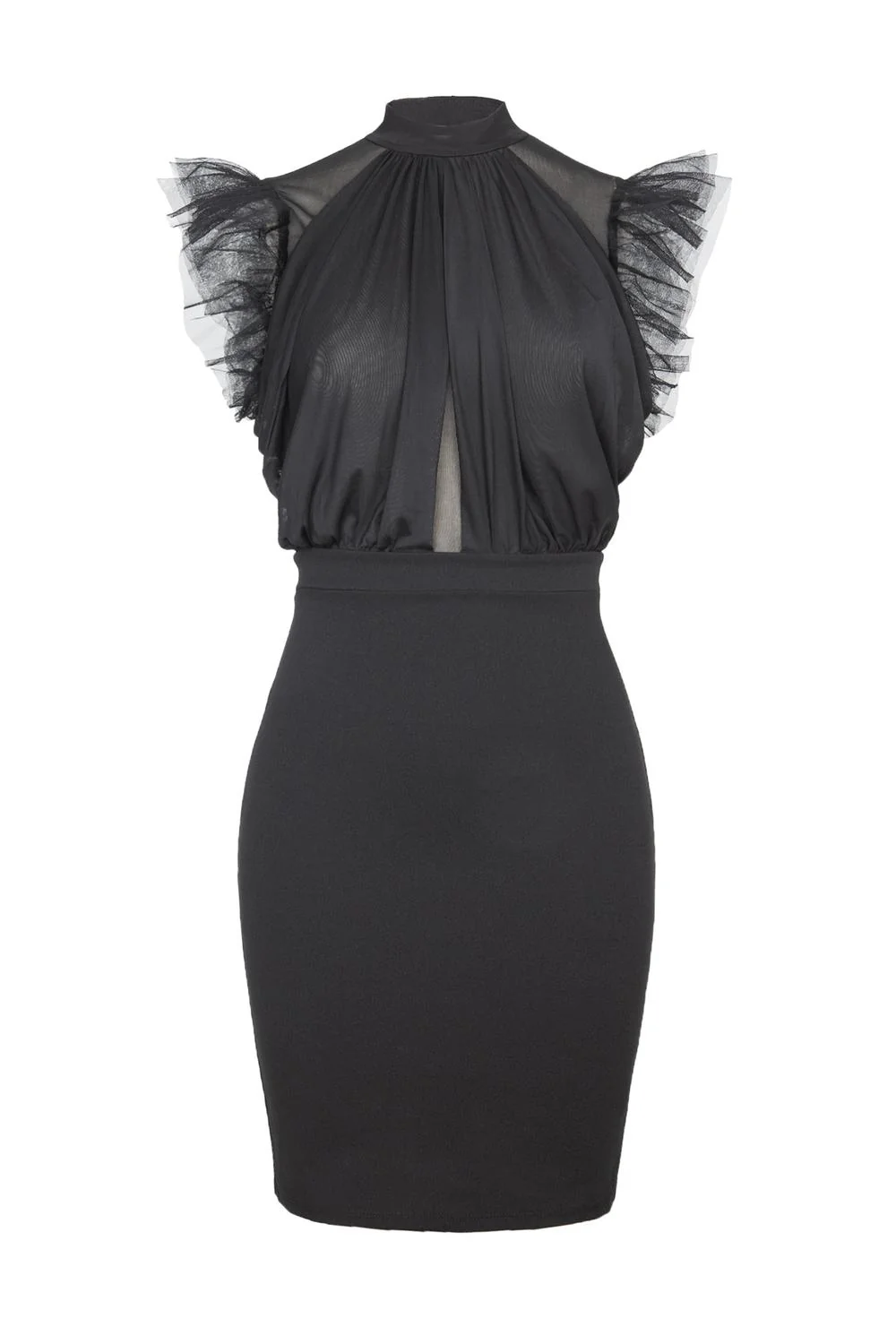 Vestido con cuello, transparencia en zona superior, piezas decorativas plisadas frontales, corte en cintura, olanes en sisas y espalda descubierta. 20-1444