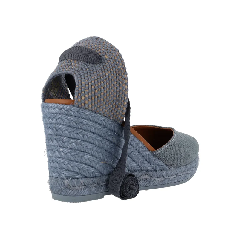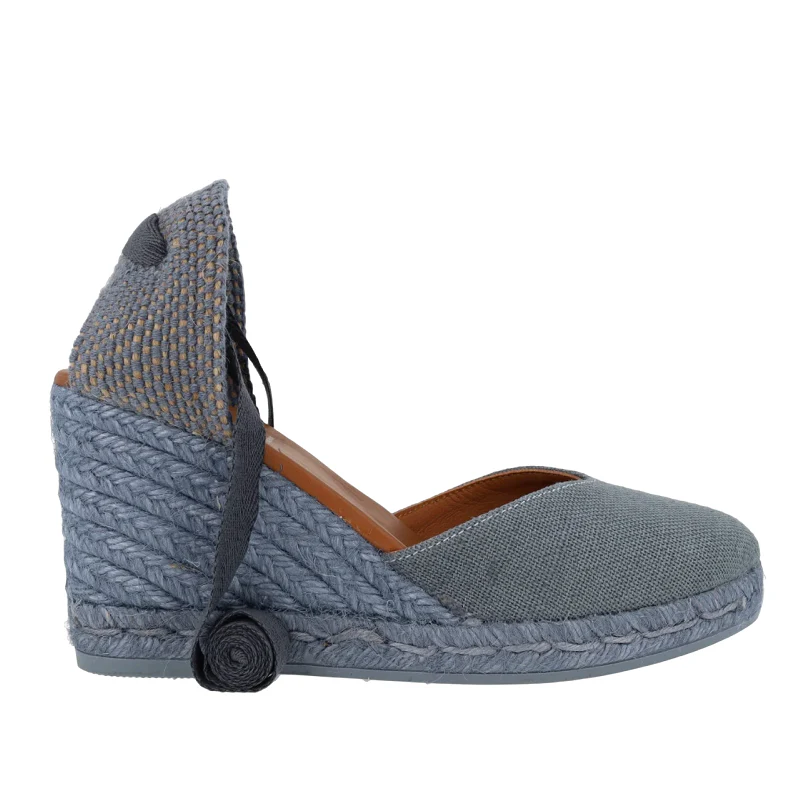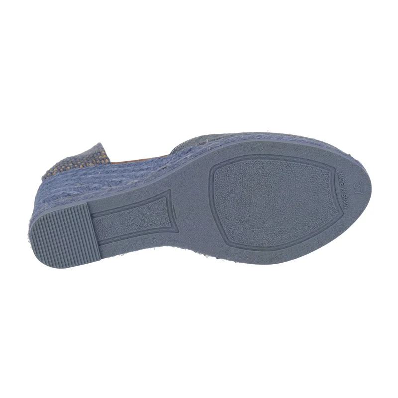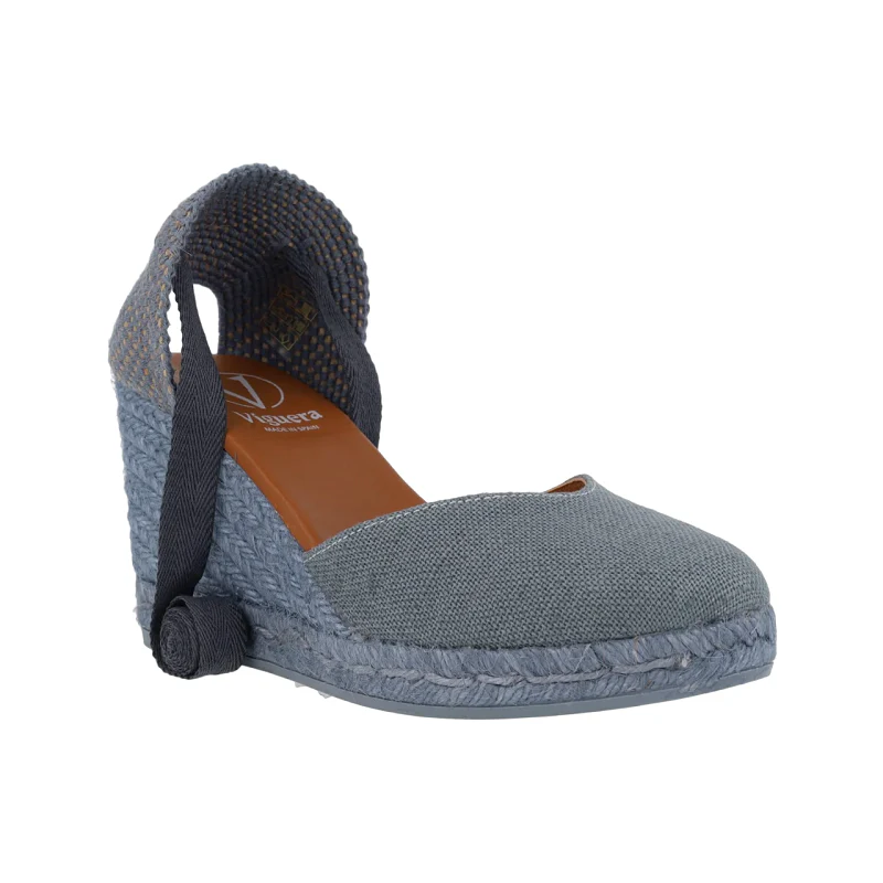 Preciosas alpargatas estilo campesinas de la marca española Viguera modelo 1939. Disponibles en azul, beige, rojo, fucsia, naranja o negras. Alpargatas elaboradas en tejido lino de primera calidad, con detalle de cintas textiles para atar a la pierna o tobillo. Interior mixto de piel y tejido, con plantillas de piel acolchadas. Cuñas altas de esparto al tono, de 8,5 cms de altura en la parte trasera (2 cms de plataforma delantera). Made in Spain.