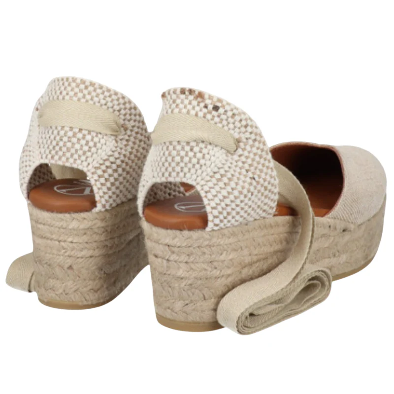 Alpargata valenciana con cintas, piso de yute de 5,5 cm de altura, de los cuales 2,5 cm son de cuña y 3 cm de plataforma, aproximadamente. Fabricada en tejido lino de la mejor calidad y con plantilla de piel súper acolchada. Comodidad, durabilidad y versatilidad de un calzado 100% español. Cuenta con la garantía de calidad de Alpargatas Viguera.