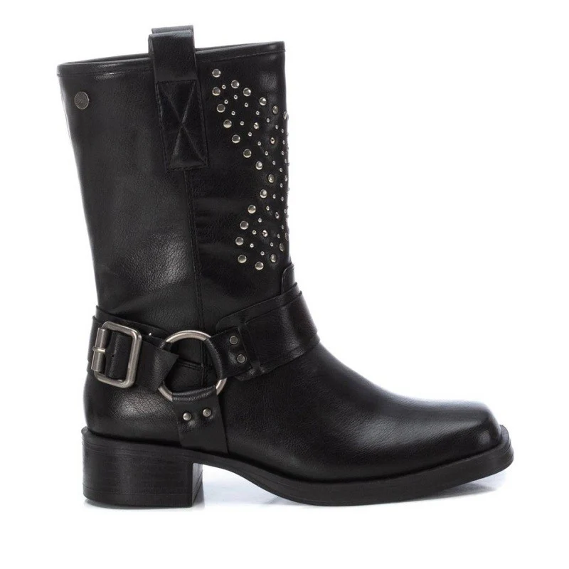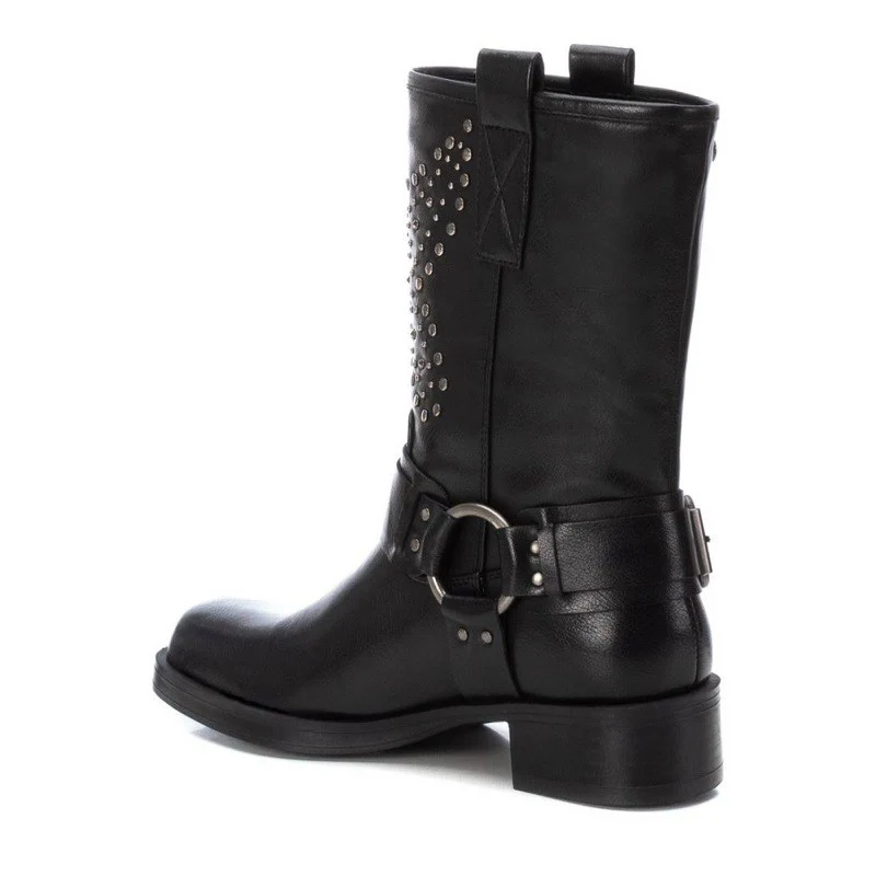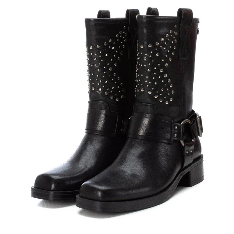 Botín motero de mujer, de la marca Xti. Fabricada en material que imita la piel. Cierre mediante cremallera interior, la cual facilita la puesta. Sus tachuelas decorativas las convierten en un modelo único y diferente.