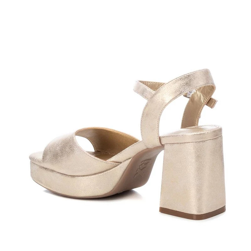 Sandalia de mujer, de la marca Xti. Fabricada en dos acabados: material que imita la piel con acabado metalizado y antelina para los colores mate. Pulsera al tobillo con hebilla regulable. Tacón ancho de 7cm con plataforma delantera forrado en el mismo material y suela antideslizante. Este modelo ha obtenido el certificado vegano por la organización mundial PETA (Organización de los derechos de los animales).