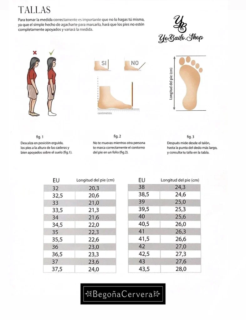 A tener en cuenta, los artículos profesionales o con modificaciones en el diseño original (zapatos de danza española con cualquier modificación en el diseño) no aceptaran ni cambios ni devoluciones.