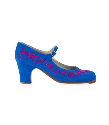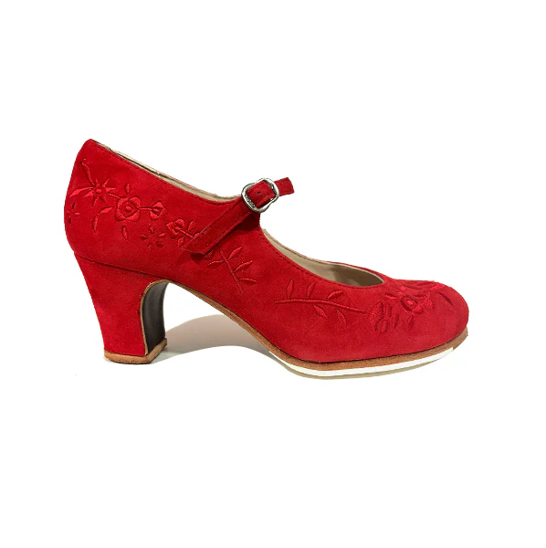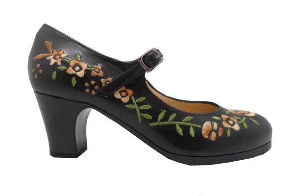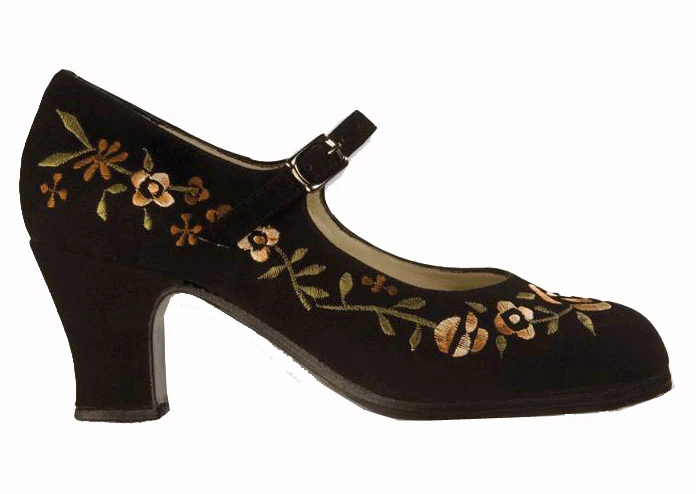 Zapato de flamenco con detalle en bordado floral y hebilla horizontal. Ideal para tus clases de danza. El modelo M12 Bordado Correa I es un modelo distinto que seguro te encantará.