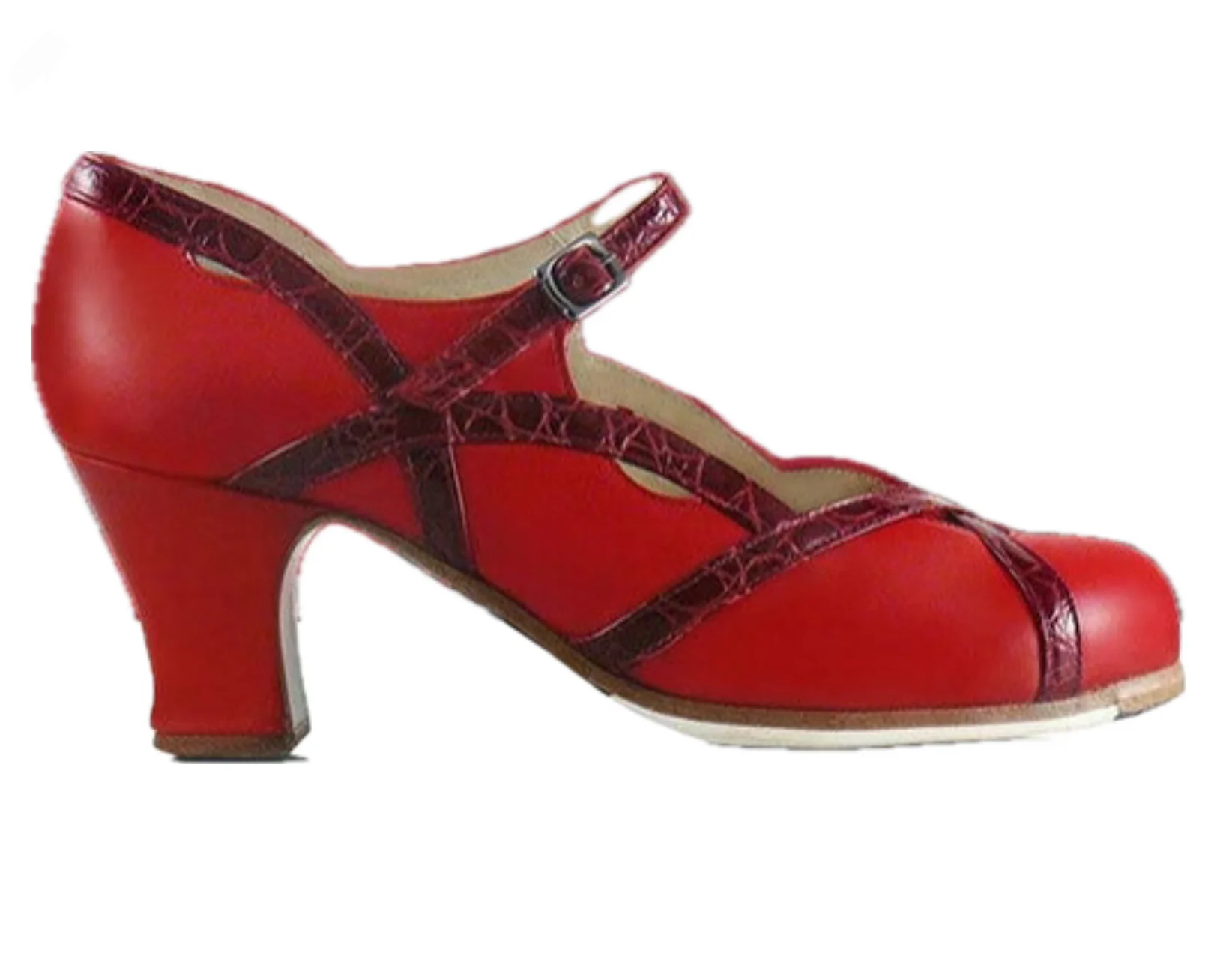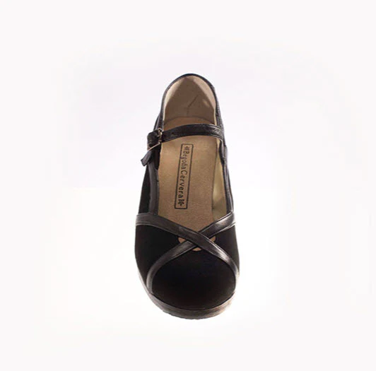 Zapato de flamenco con hebilla y detalle en ribetes. Básico pero con ribetes formando un dibujo diferente. Ideal para tus clases de danza española.