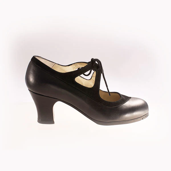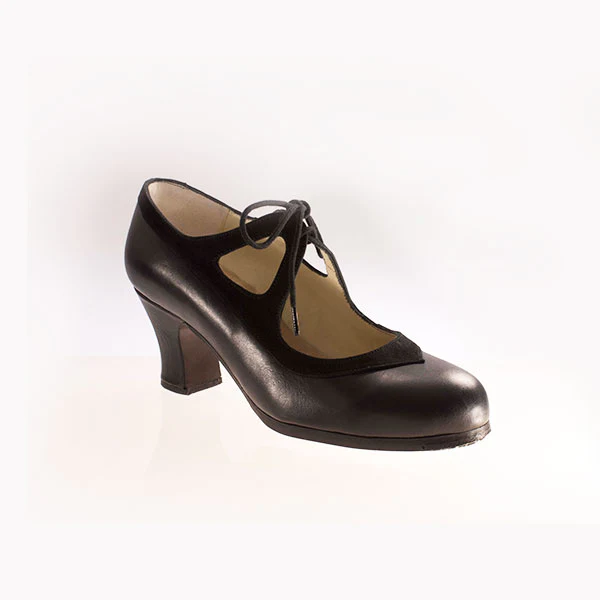 Zapato de danza española muy femenino. Un básico que no puede faltar. Con detalle en el empeine. Se ata con cordones. Elegante y sencillo de Begoña Cervera.